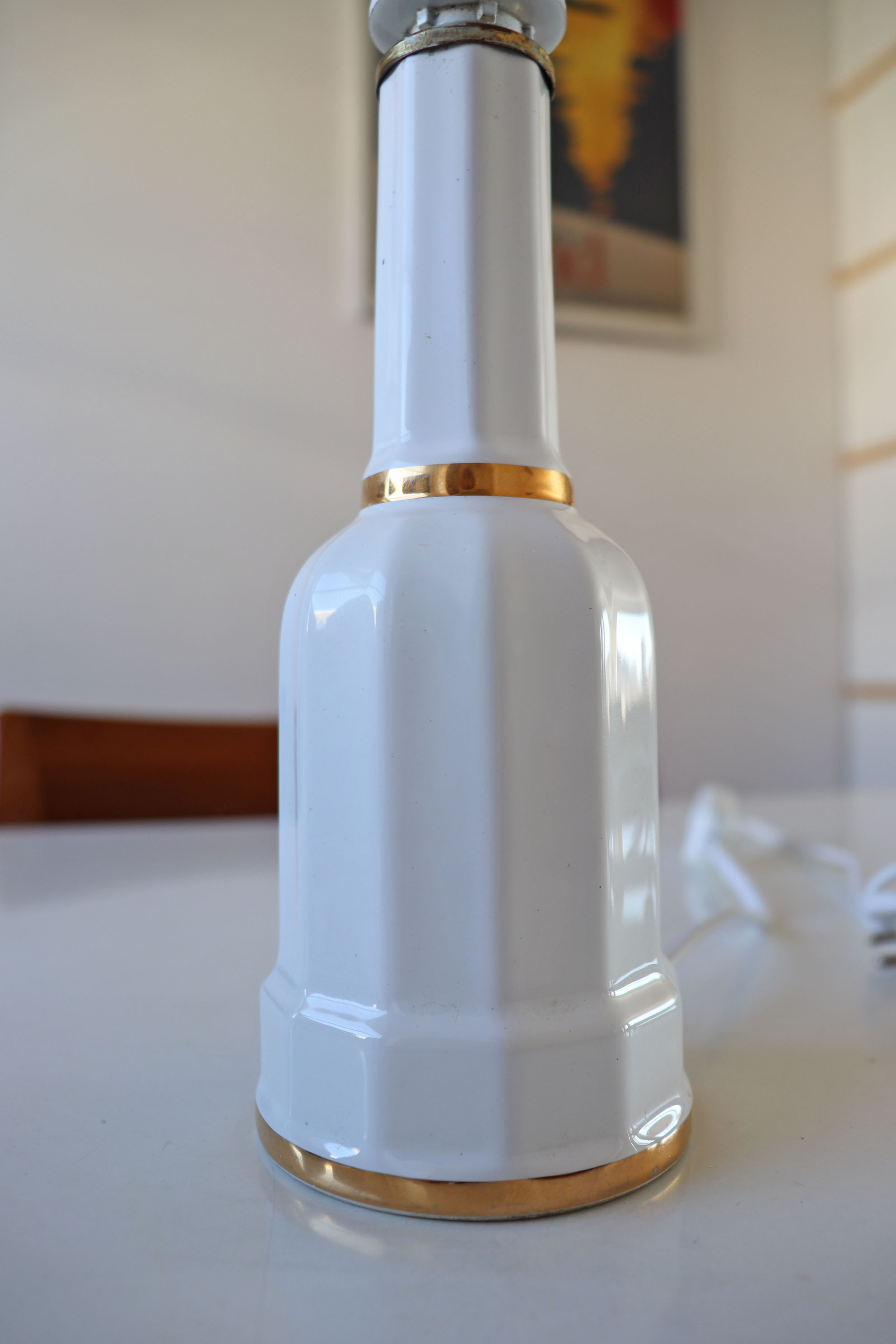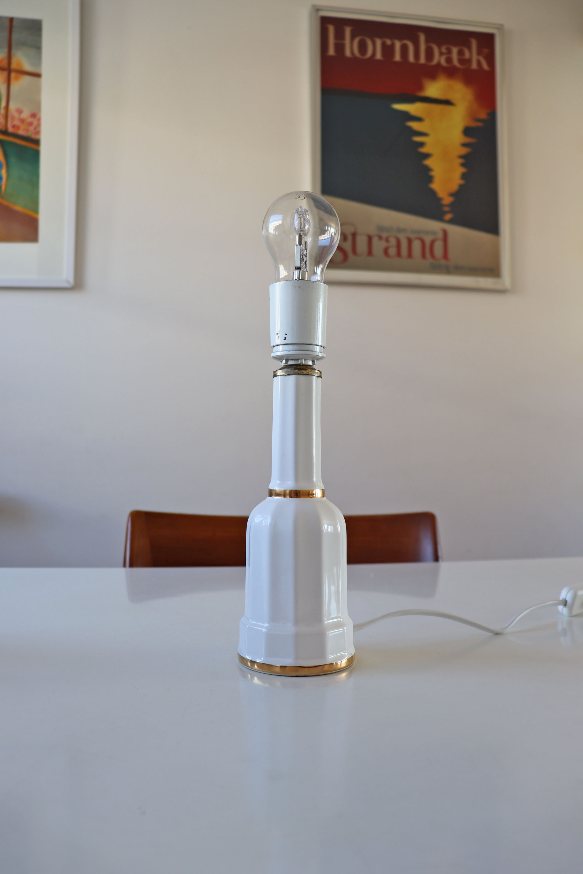 Kaunis Søholm Stentøjn valmistama keraaminen ”Heiberg” pöytävalaisin arviolta 1980 -luvulta. Tässä valkoisessa valaisimessa on kauniit kullanväriset renkaat alhaalla ja keskiosassa.