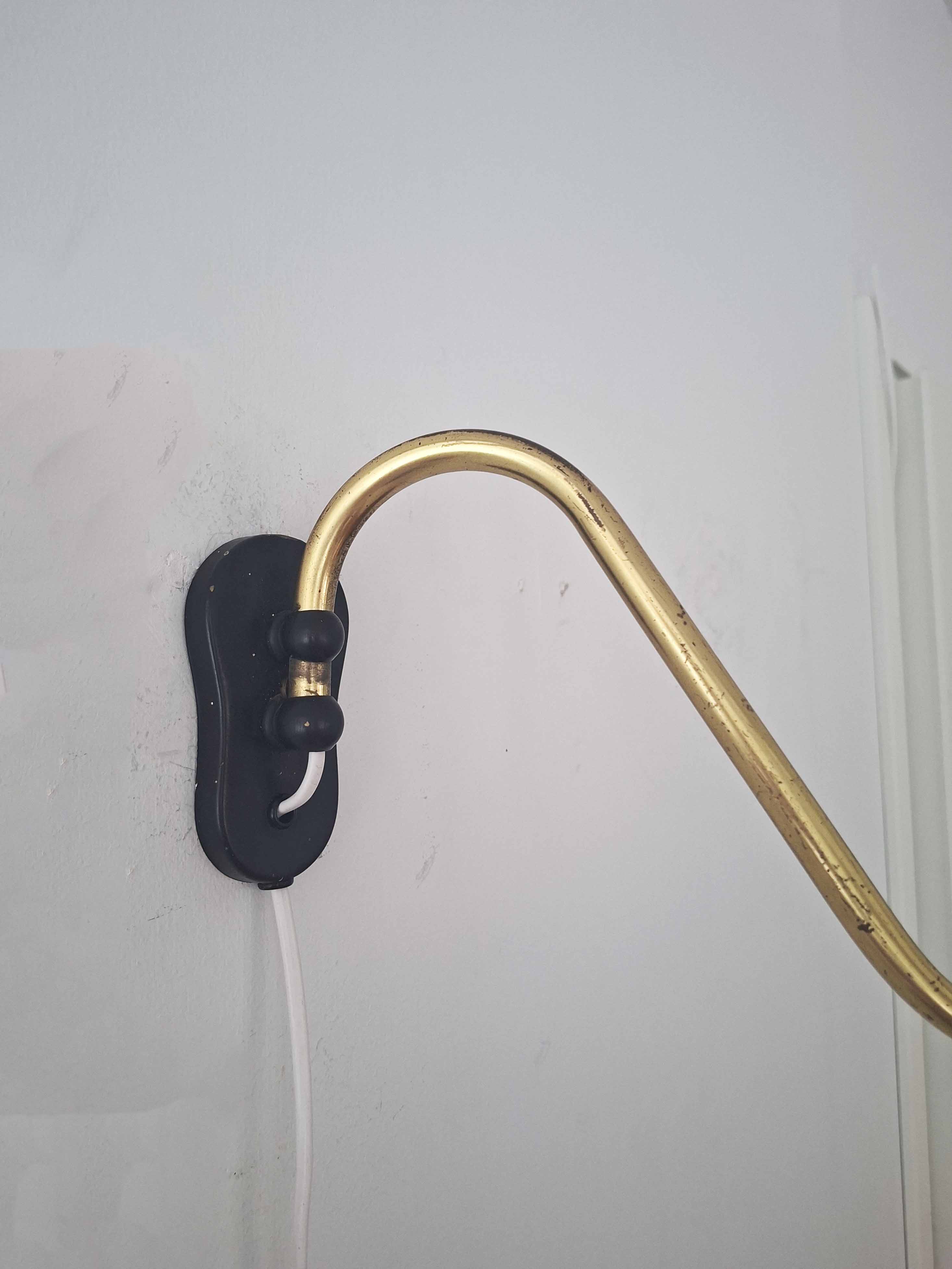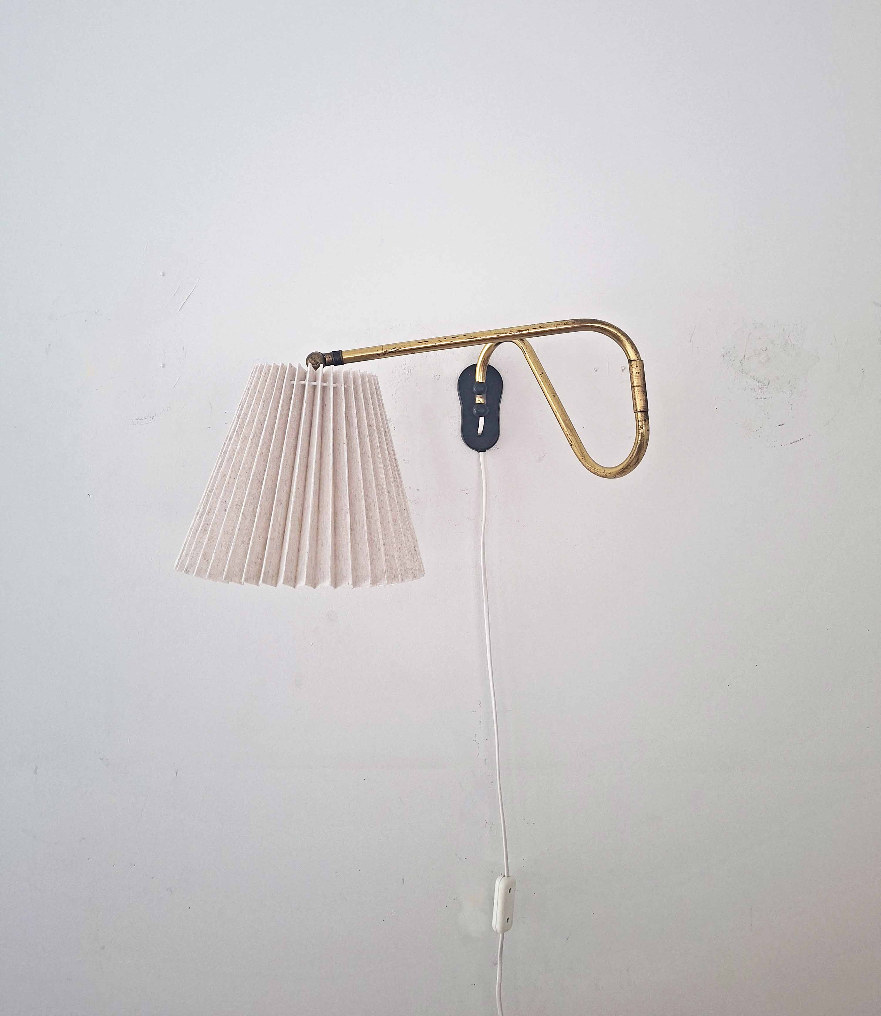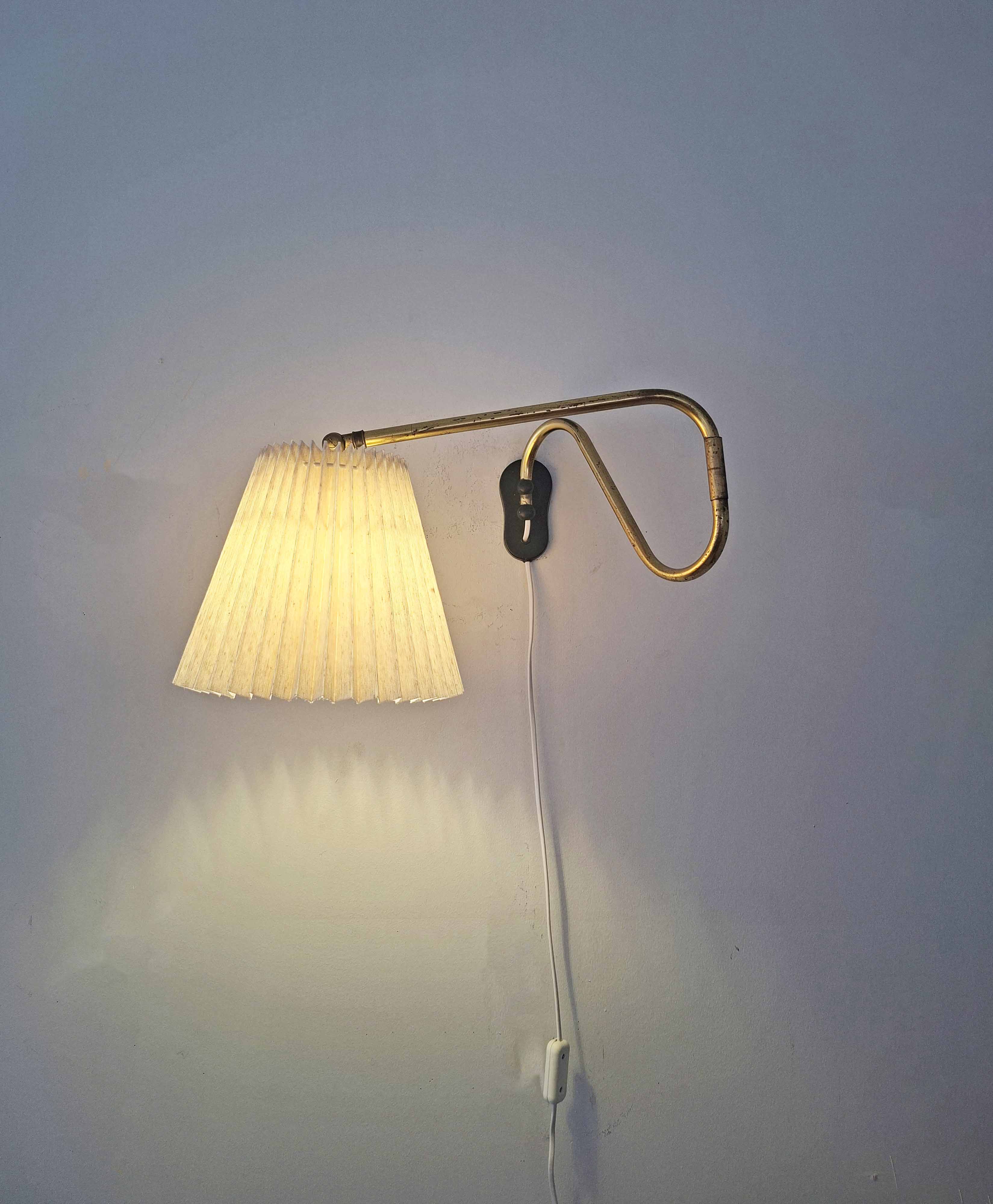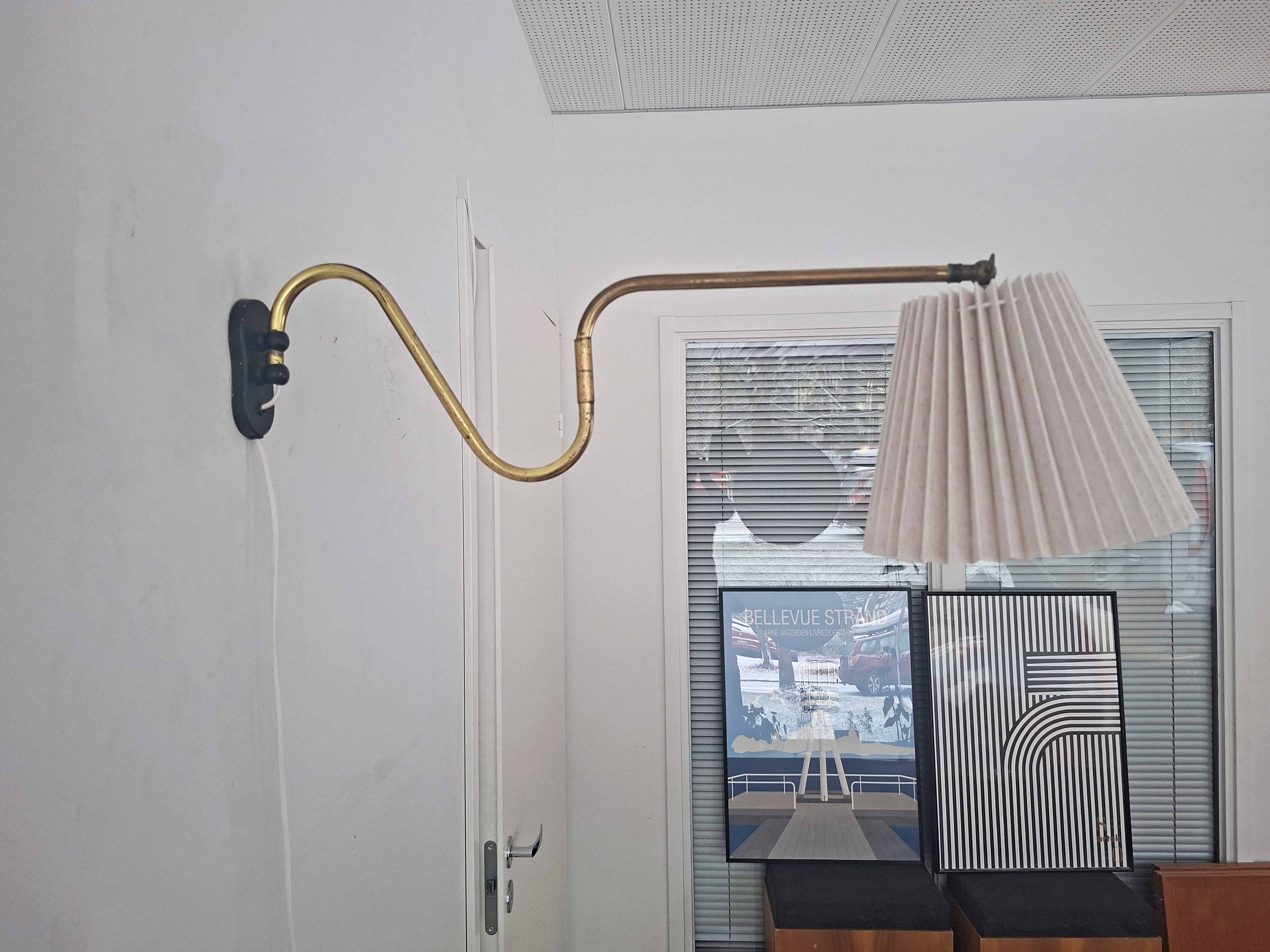 Tässä tyylikkäässä vintagevalaisimessa on pitkä ja säädettävä messinkinen varsi. Messingissä on kaunis vuosikymmenten saatossa syntynyt patina. Valaisin on valmistettu Tanskassa 1940- tai 1950 -luvulla.
