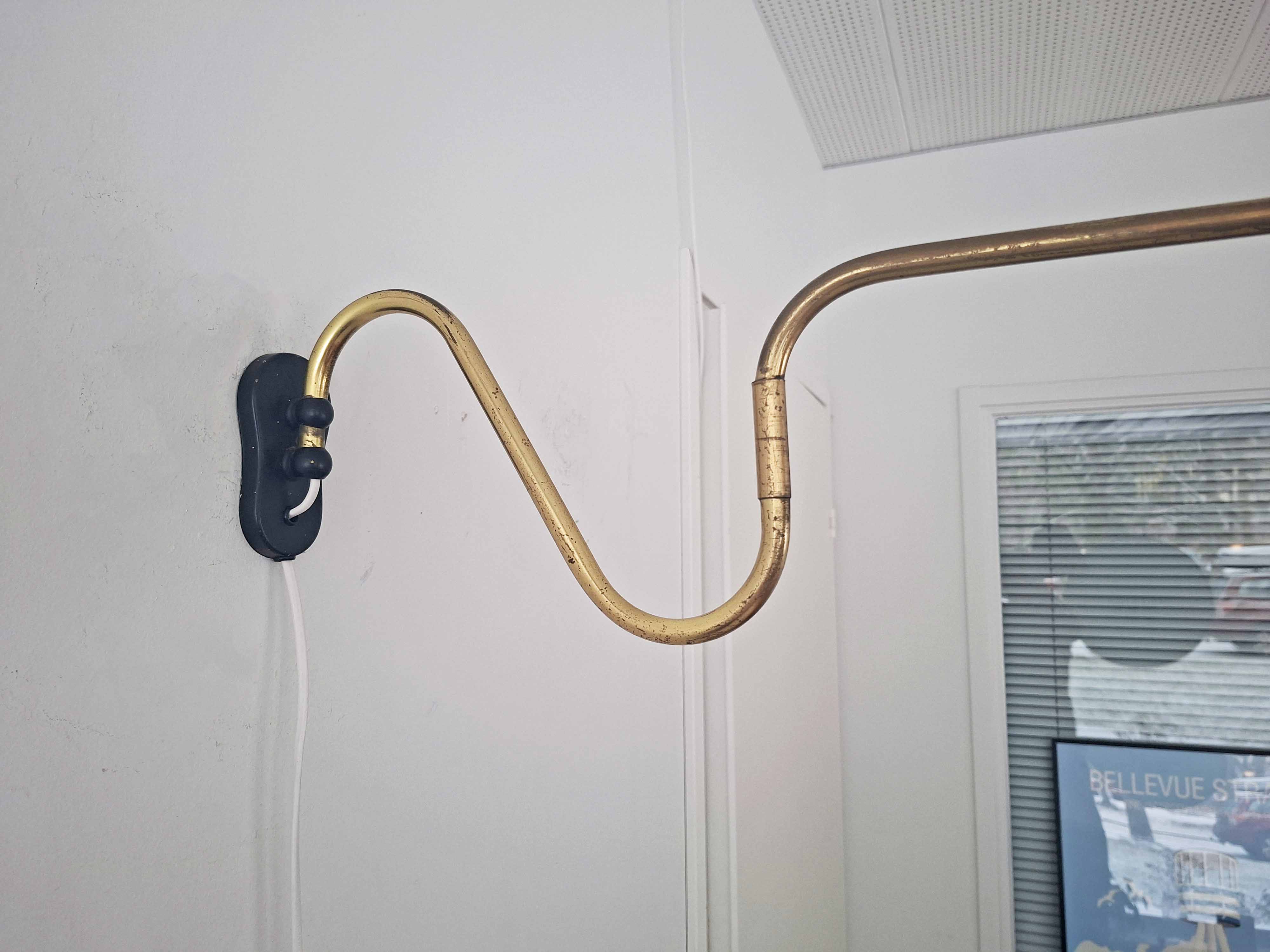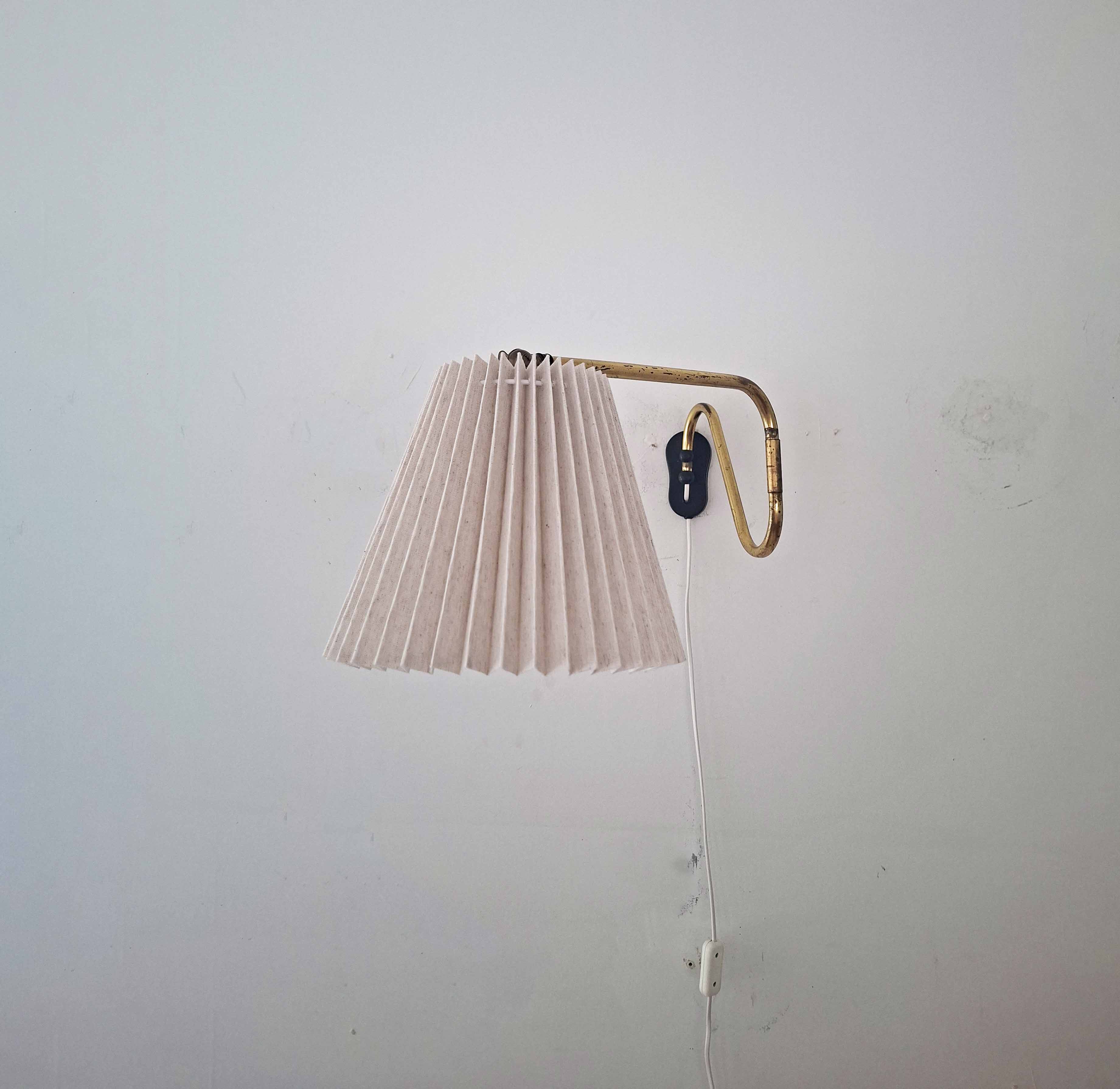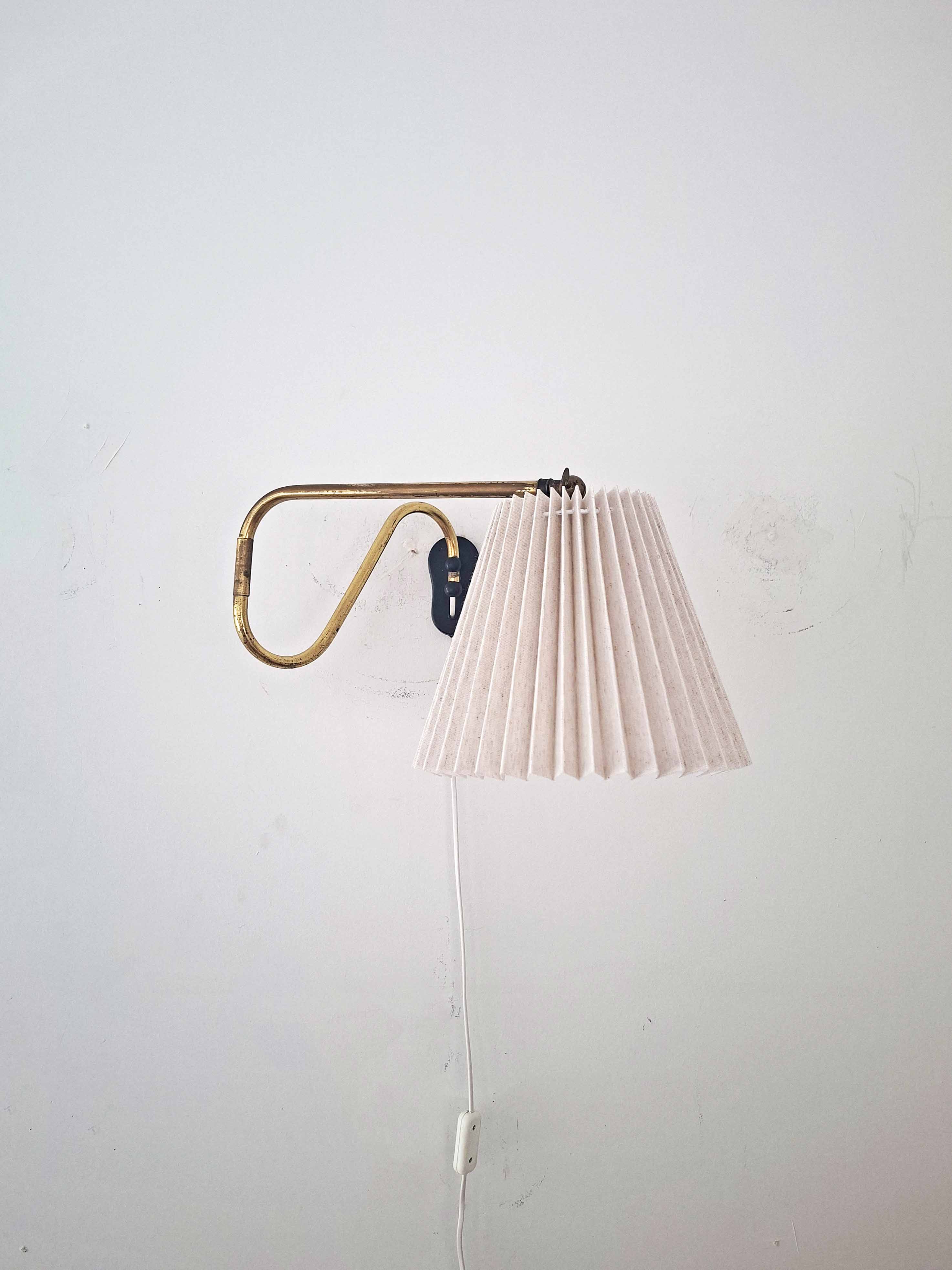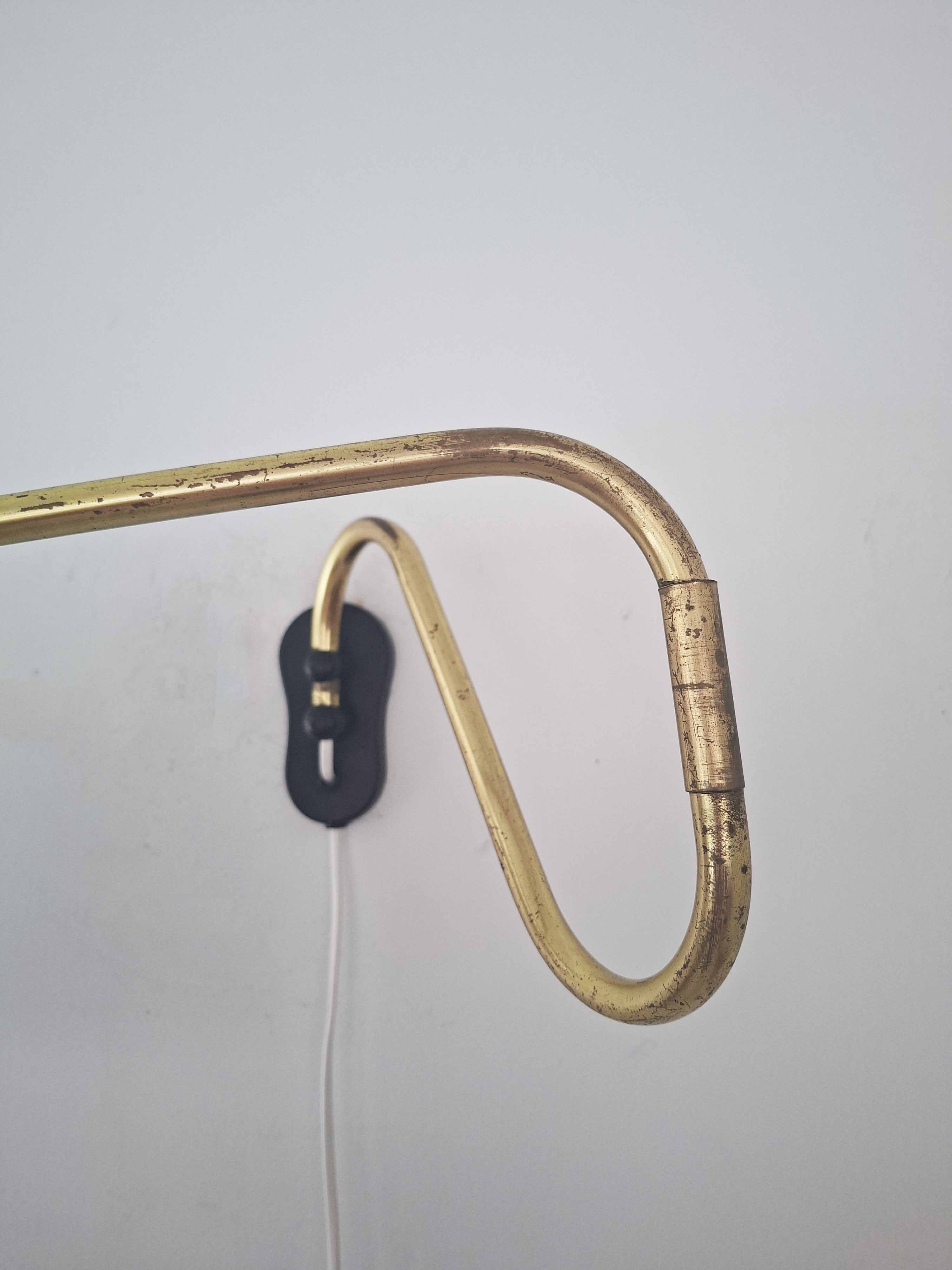 Tässä tyylikkäässä vintagevalaisimessa on pitkä ja säädettävä messinkinen varsi. Messingissä on kaunis vuosikymmenten saatossa syntynyt patina. Valaisin on valmistettu Tanskassa 1940- tai 1950 -luvulla.