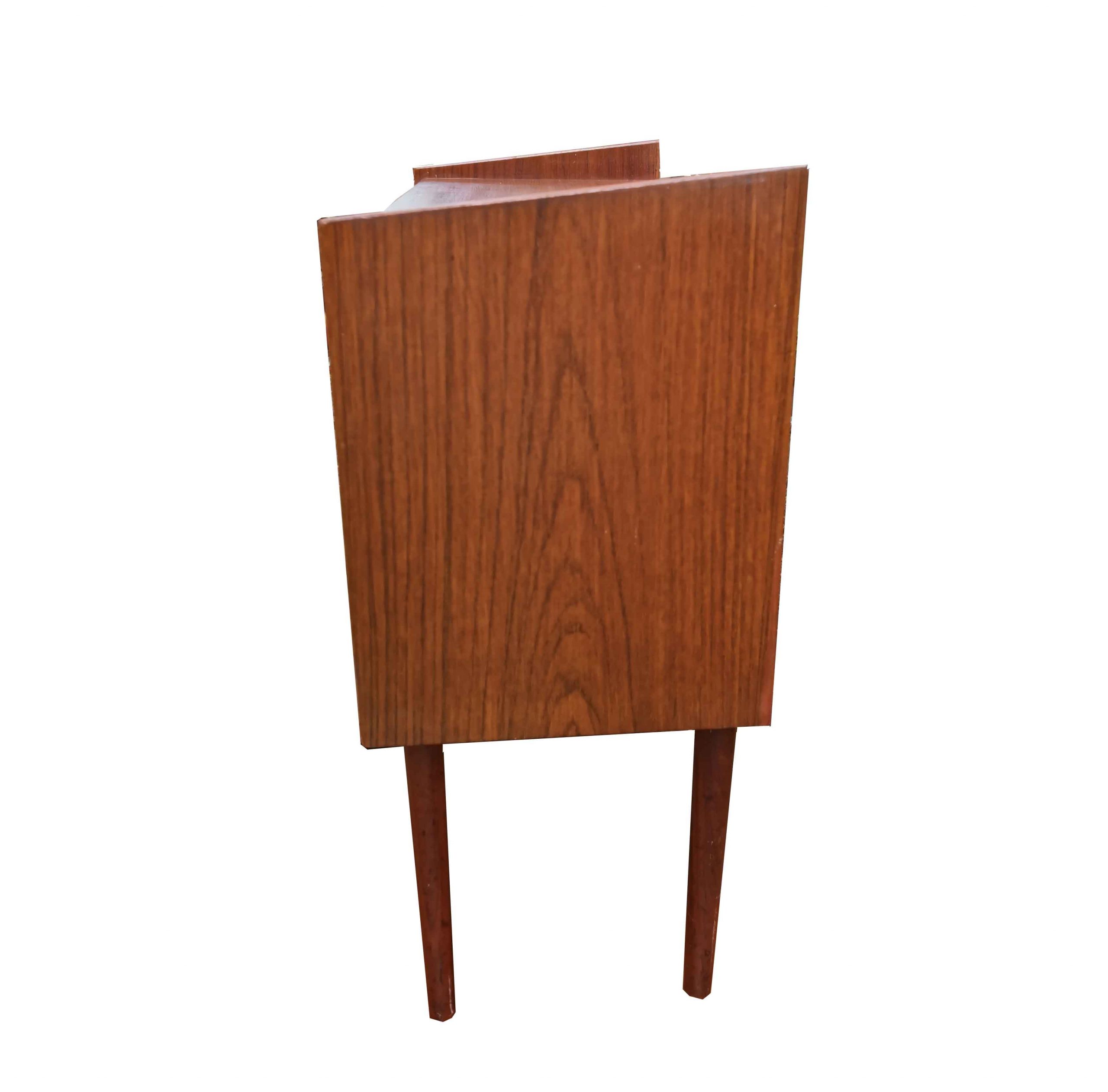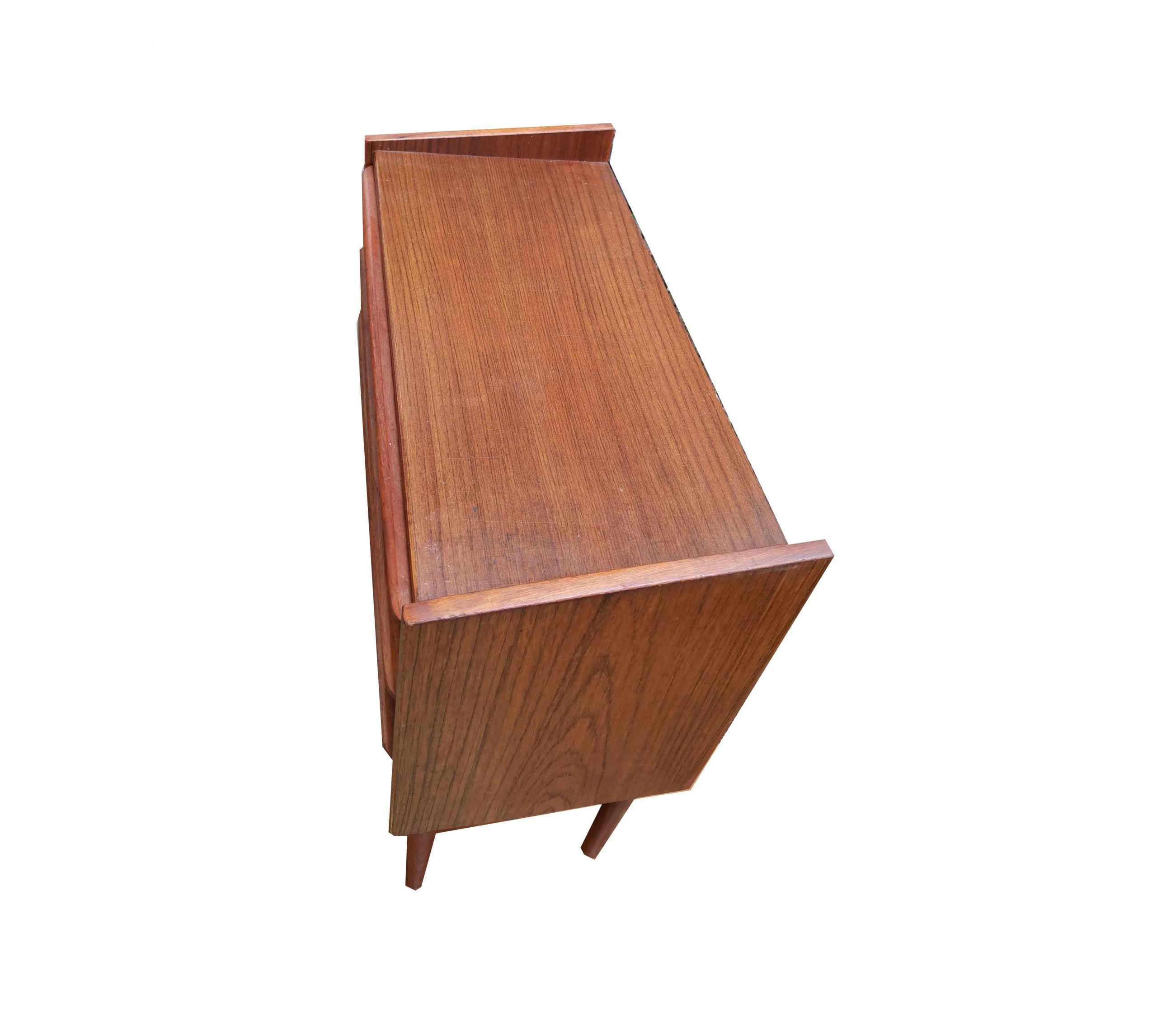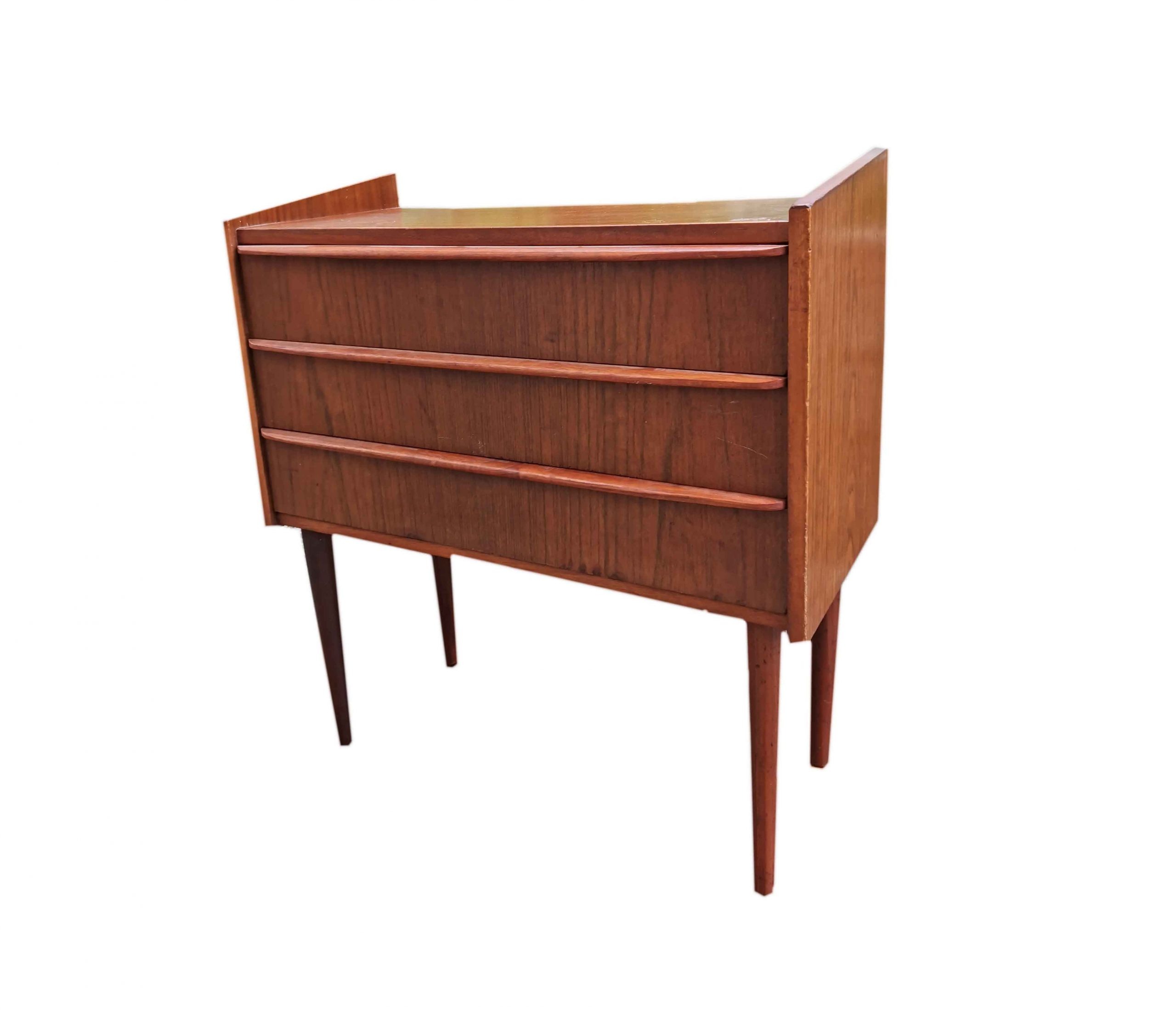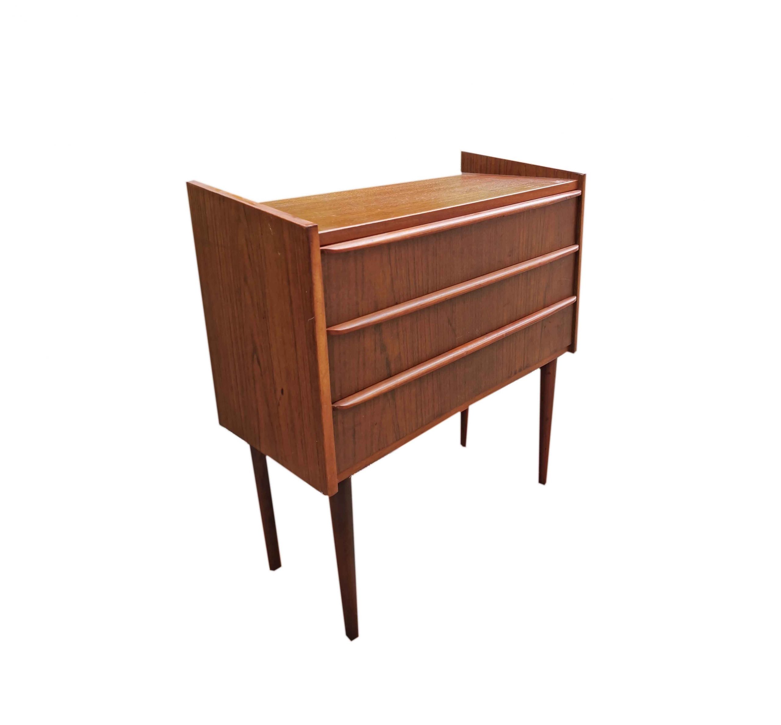 Ihastuttava ja hieman erilainen tanskalainen teak-lipasto viime vuosisadan puolivälistä. Tästä pikkukaapistosta tekee persoonallisen sen hauskasti muotoillut nousevat reunat kaapin sivuilla.