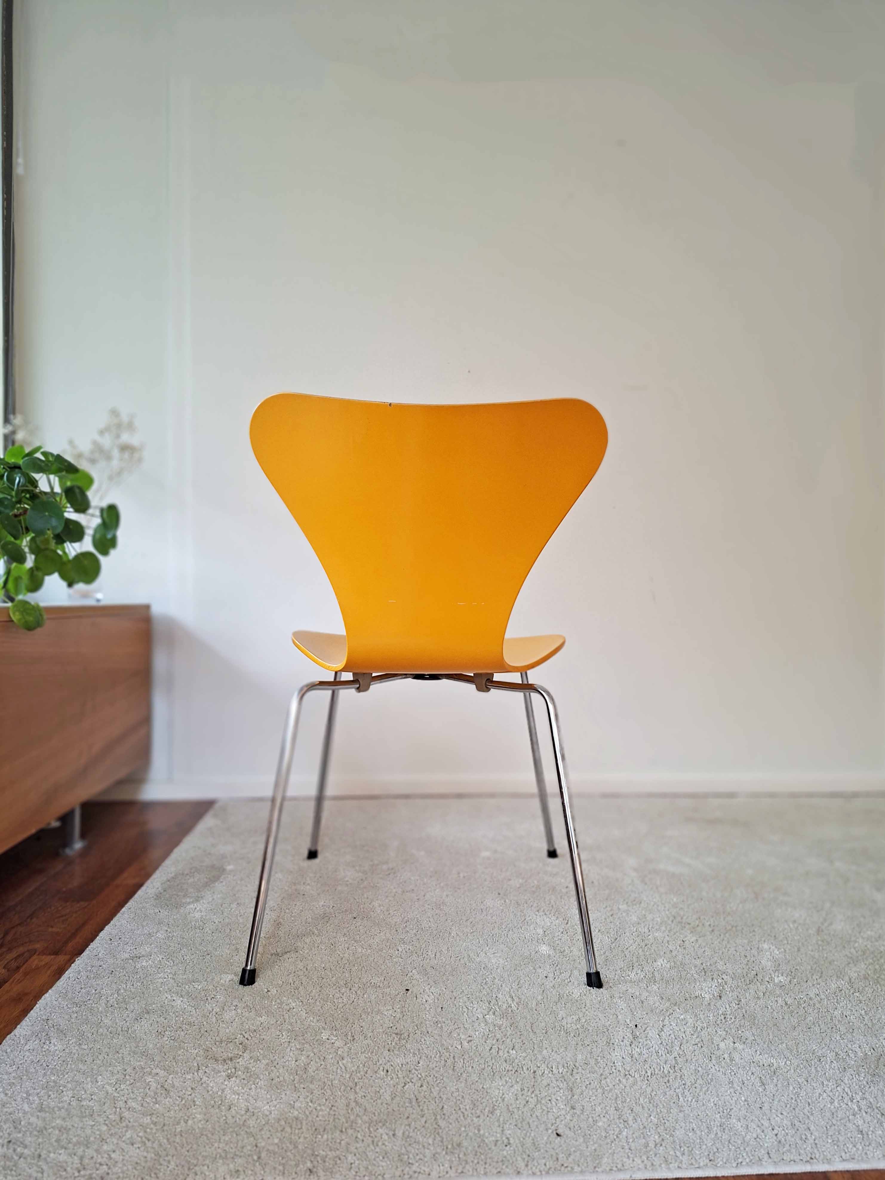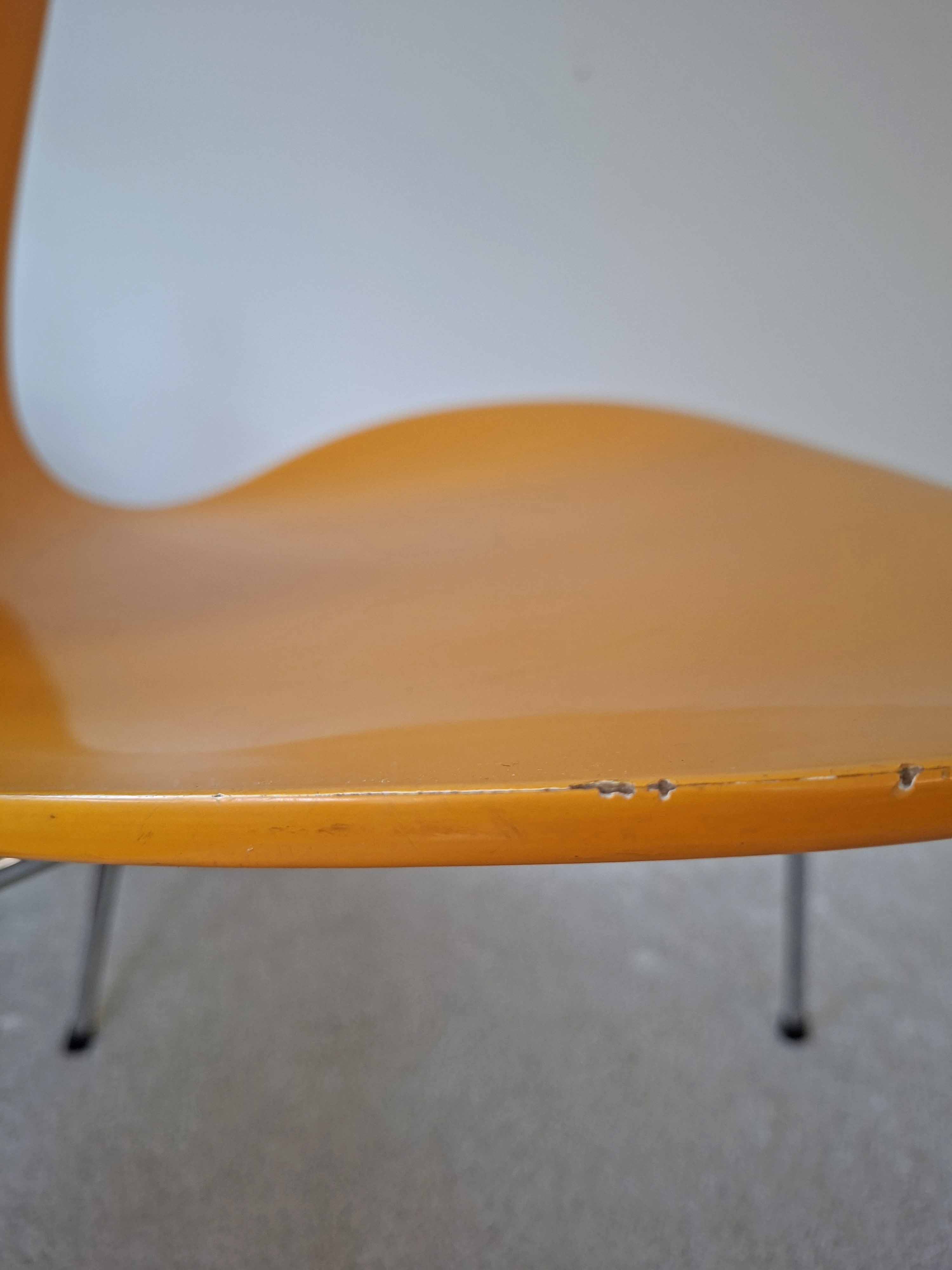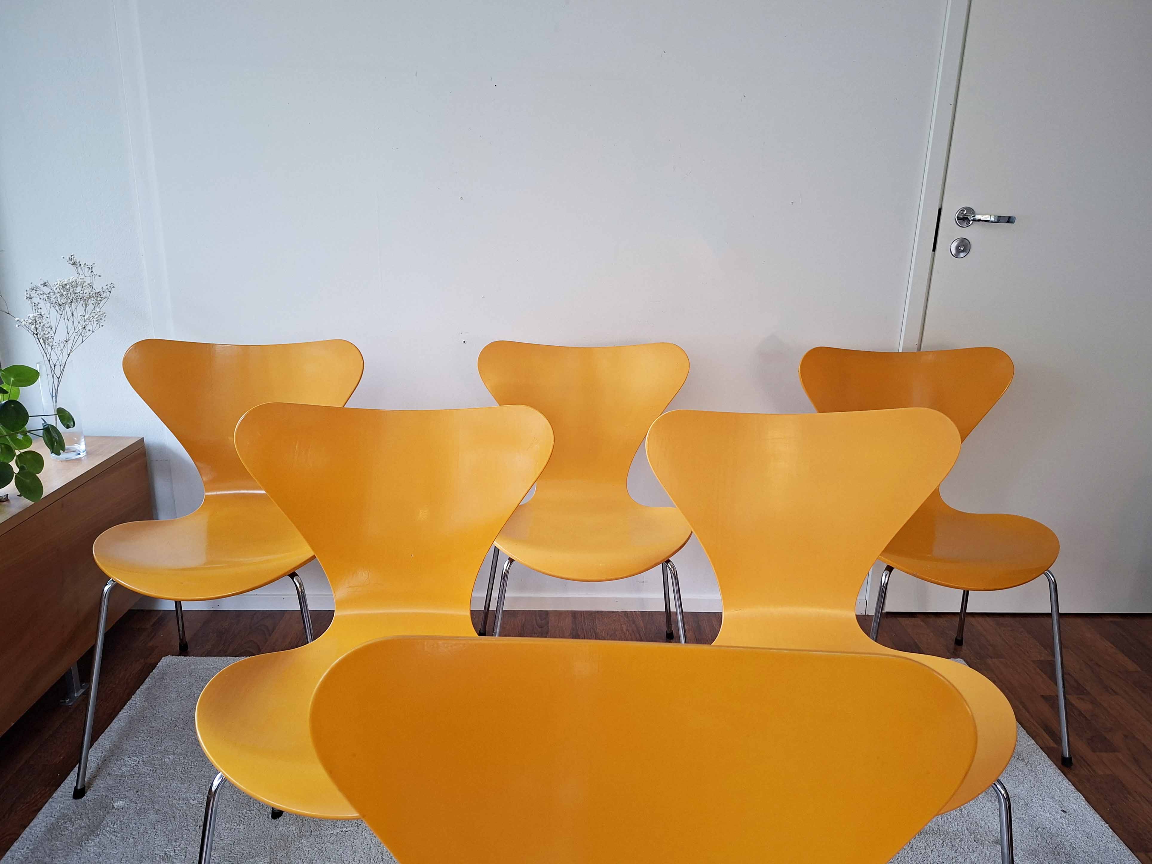 Arne Jacobsenin vuonna 1955 suunnittelema SERIES 7™, eli tuttavallisemmin ”Seiska -tuoli” kauniin keltaisessa värissä. Tuoleja on varastossa yhteensä 27 kappaletta, joten tässä on hieno mahdollisuus myös isomman ryhmän hankintaan.