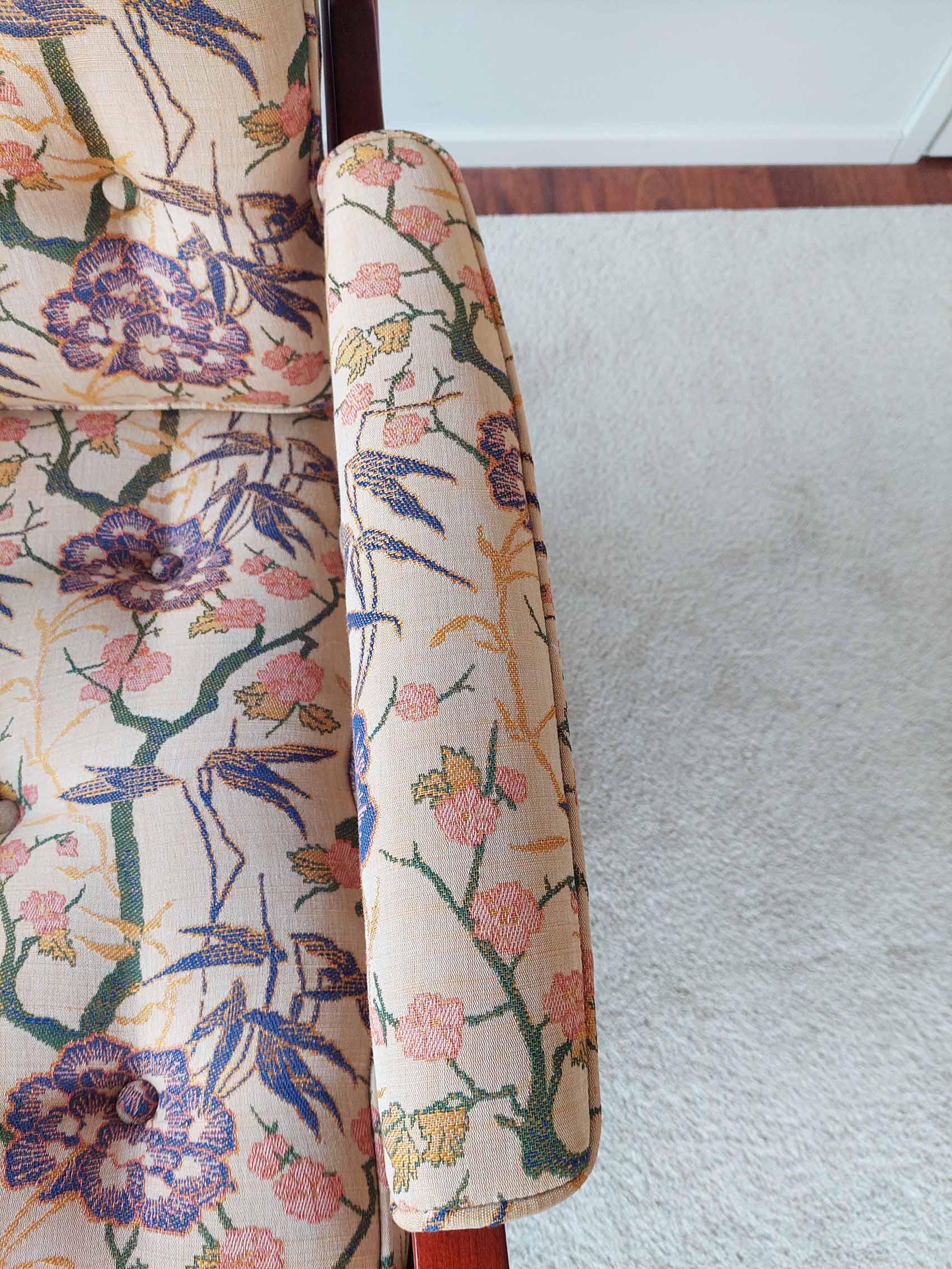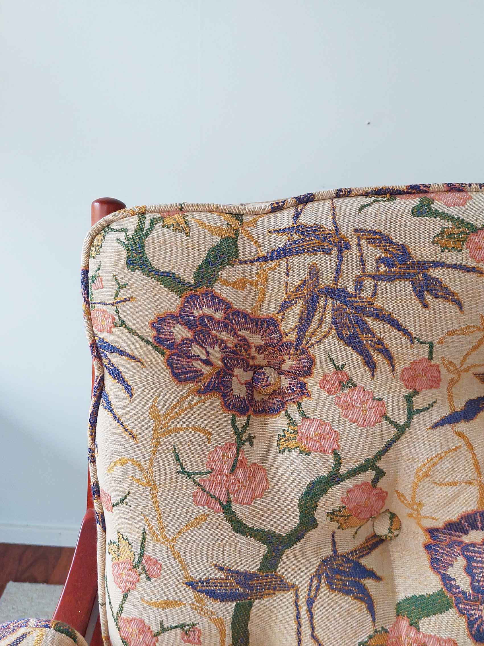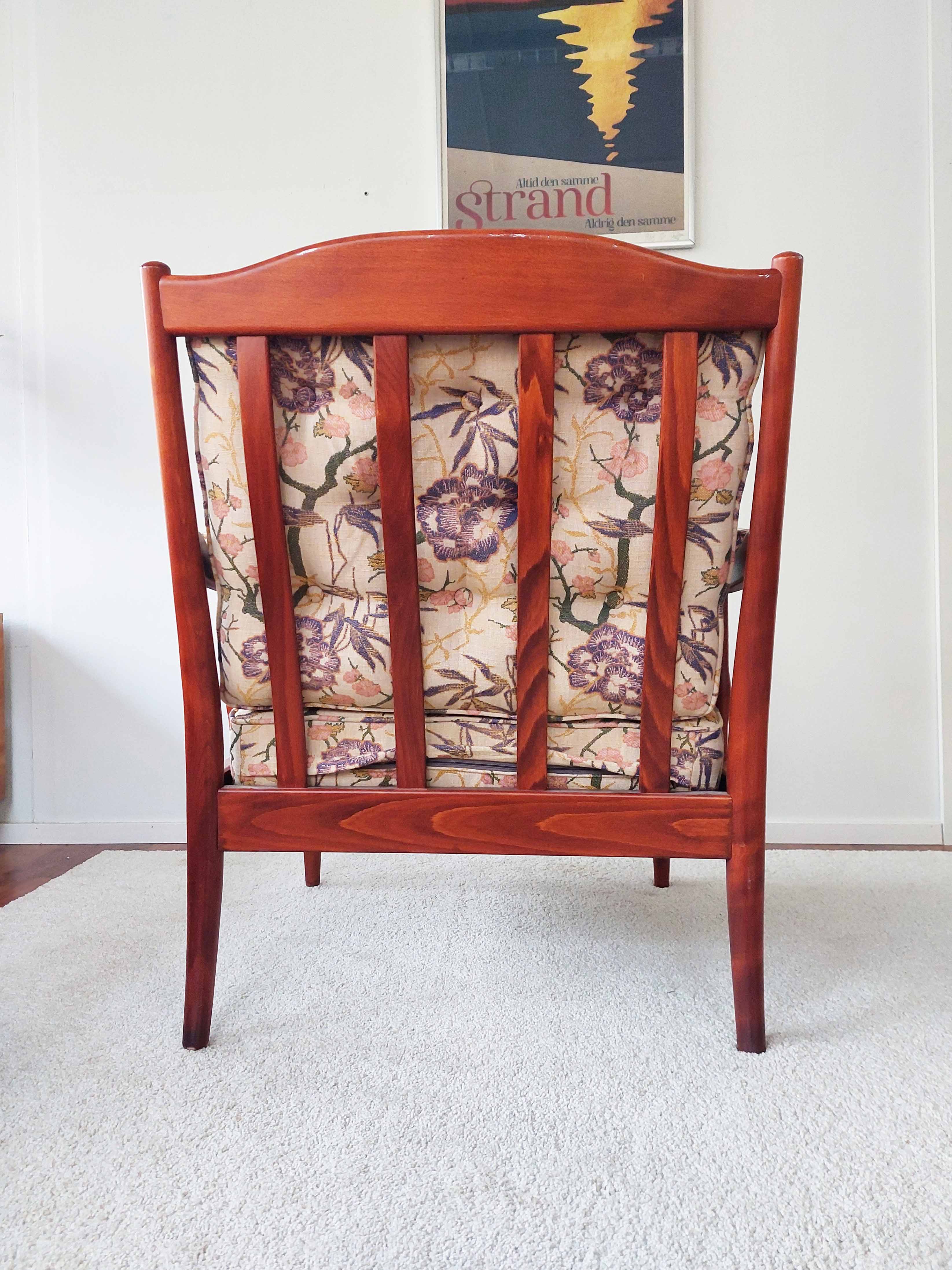 Tämä laadukas ja hyväkuntoinen vintage-nojatuoli on valmistettu massiivipyökistä kestämään aikaa ja käyttöä. Tuolissa on todella kaunis vaaleapohjainen kukkaverhoilu, joka tuo mieleen Svenskt Tennin kankaat.