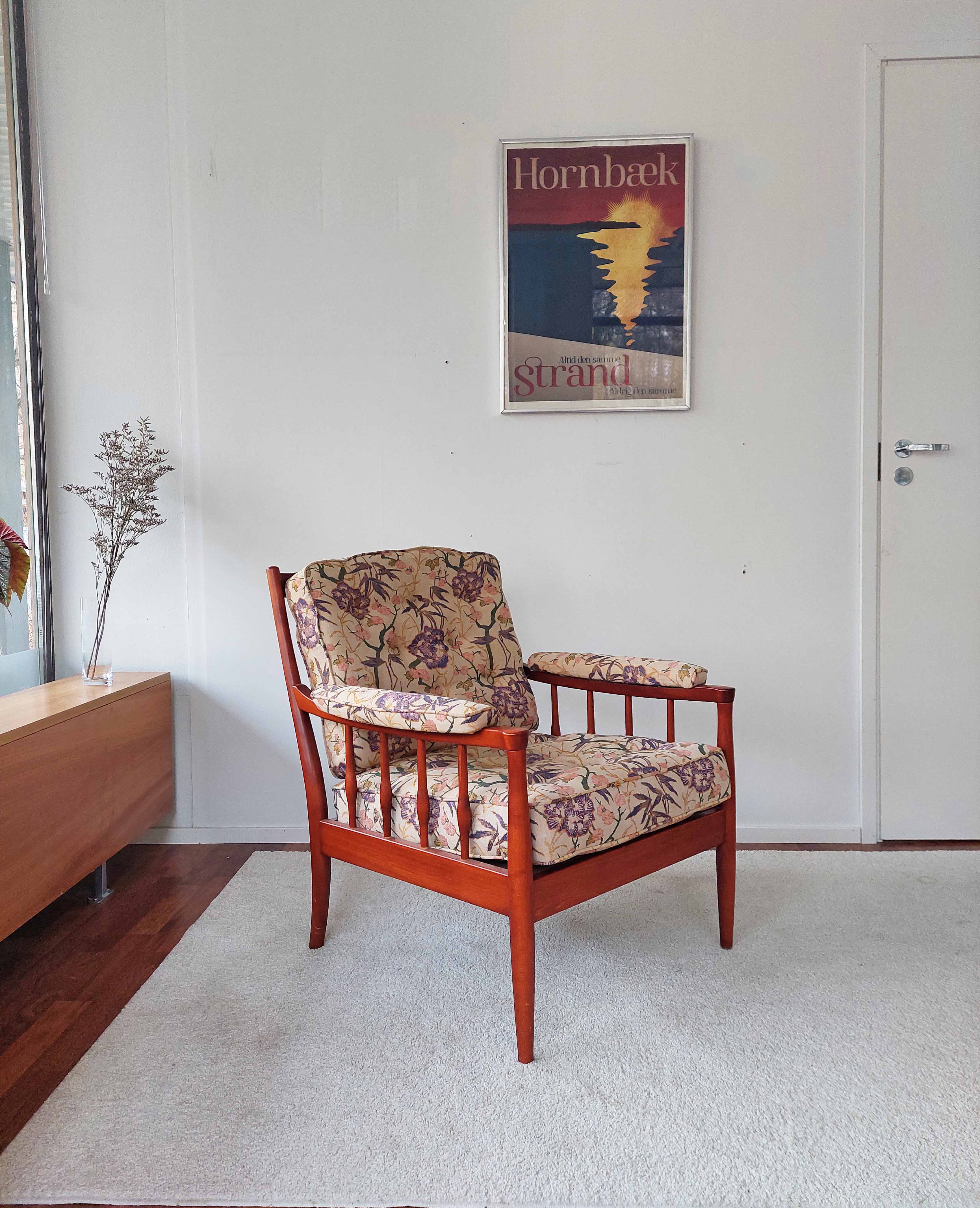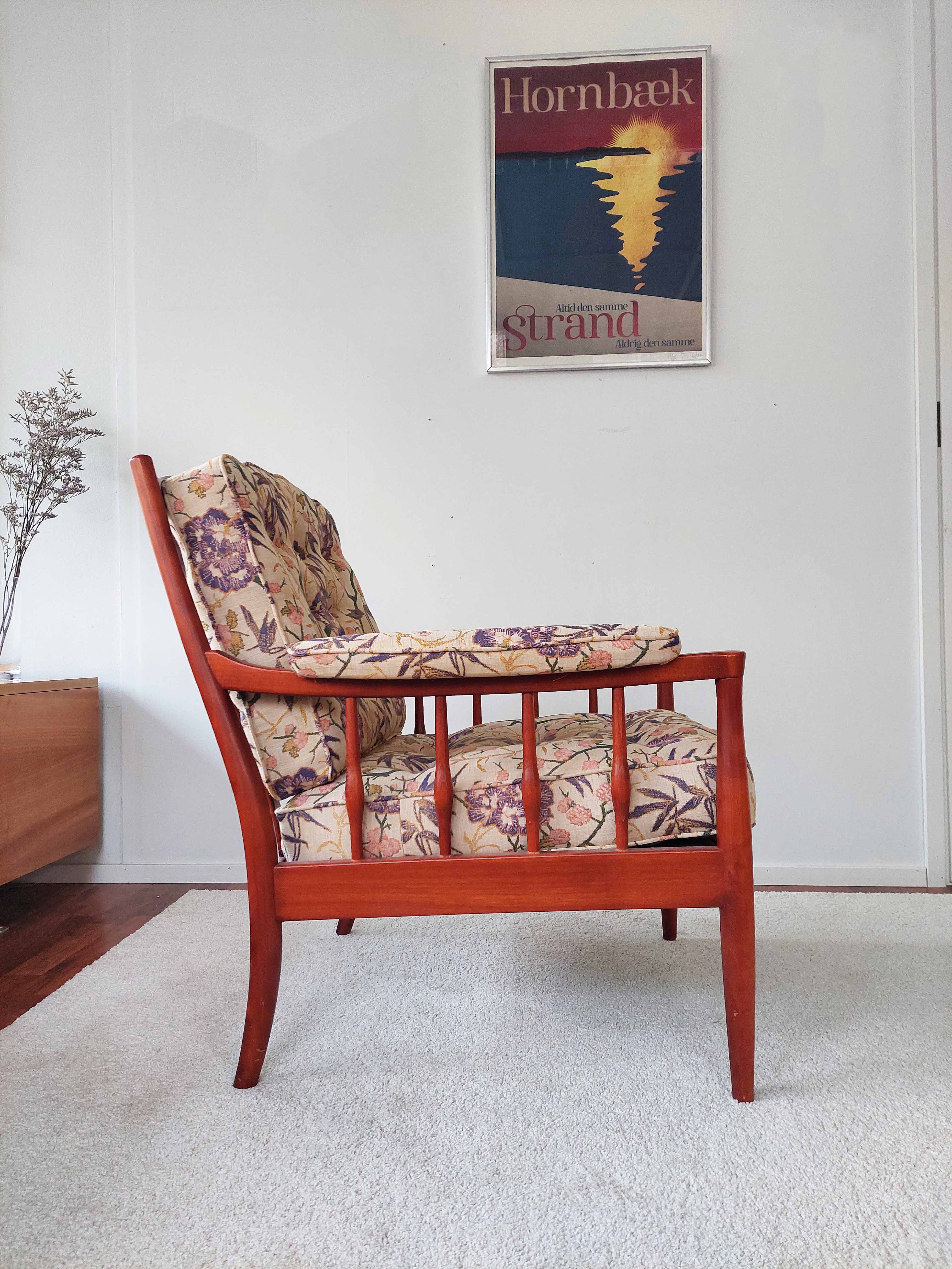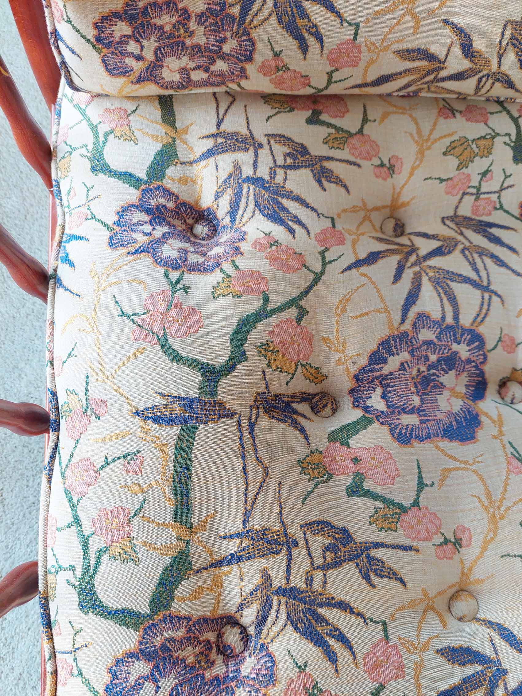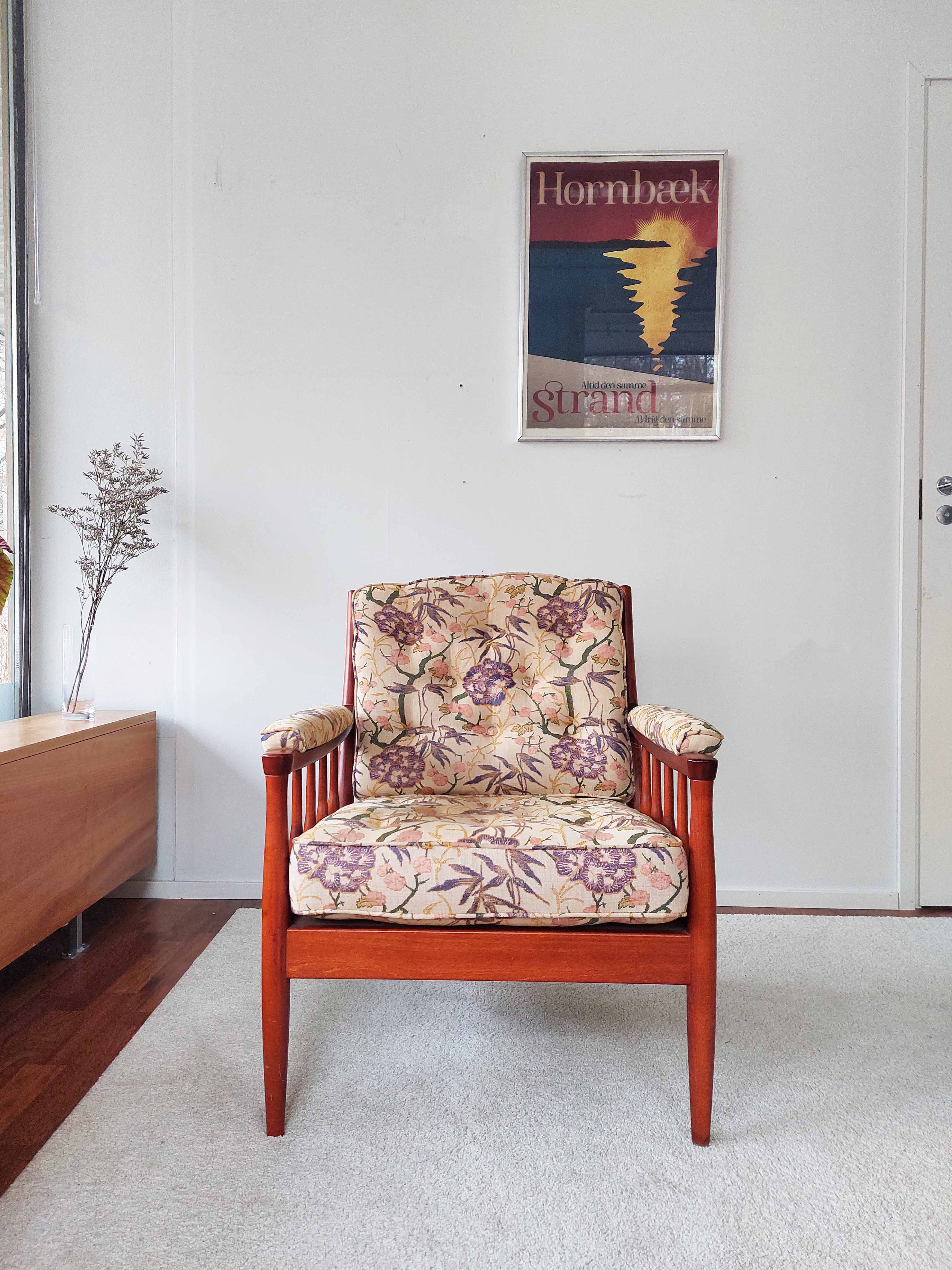 Tämä laadukas ja hyväkuntoinen vintage-nojatuoli on valmistettu massiivipyökistä kestämään aikaa ja käyttöä. Tuolissa on todella kaunis vaaleapohjainen kukkaverhoilu, joka tuo mieleen Svenskt Tennin kankaat.