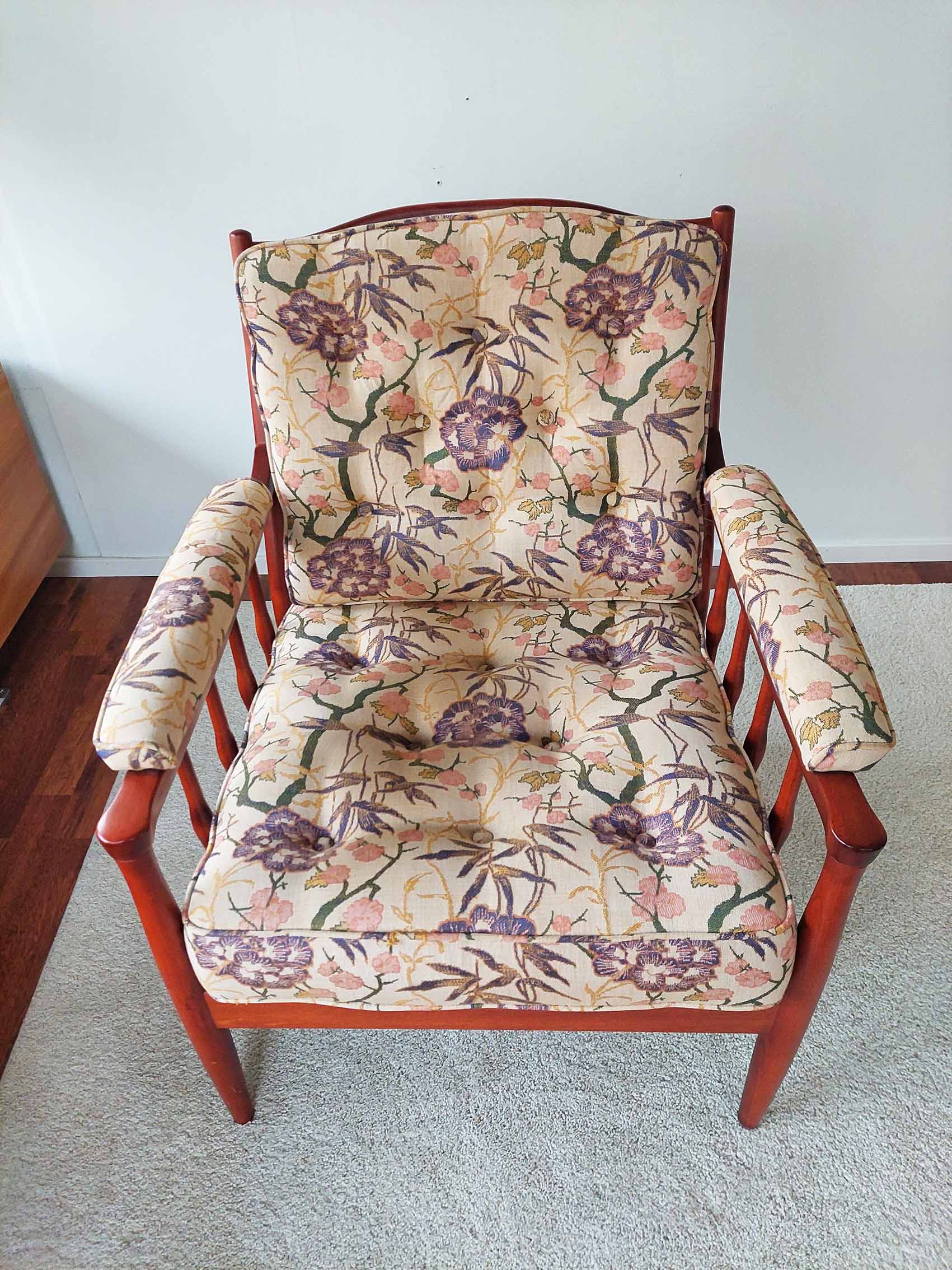 Tuoli on 1960 -luvun mööpeliksi oikein hyvässä kunnossa ja pehmuste on myös säilynyt napakkana sekä kangas siistinä. Kaunis ja persoonallinen tuoli esimerkiksi olo- tai makuuhuonetta koristamaan.