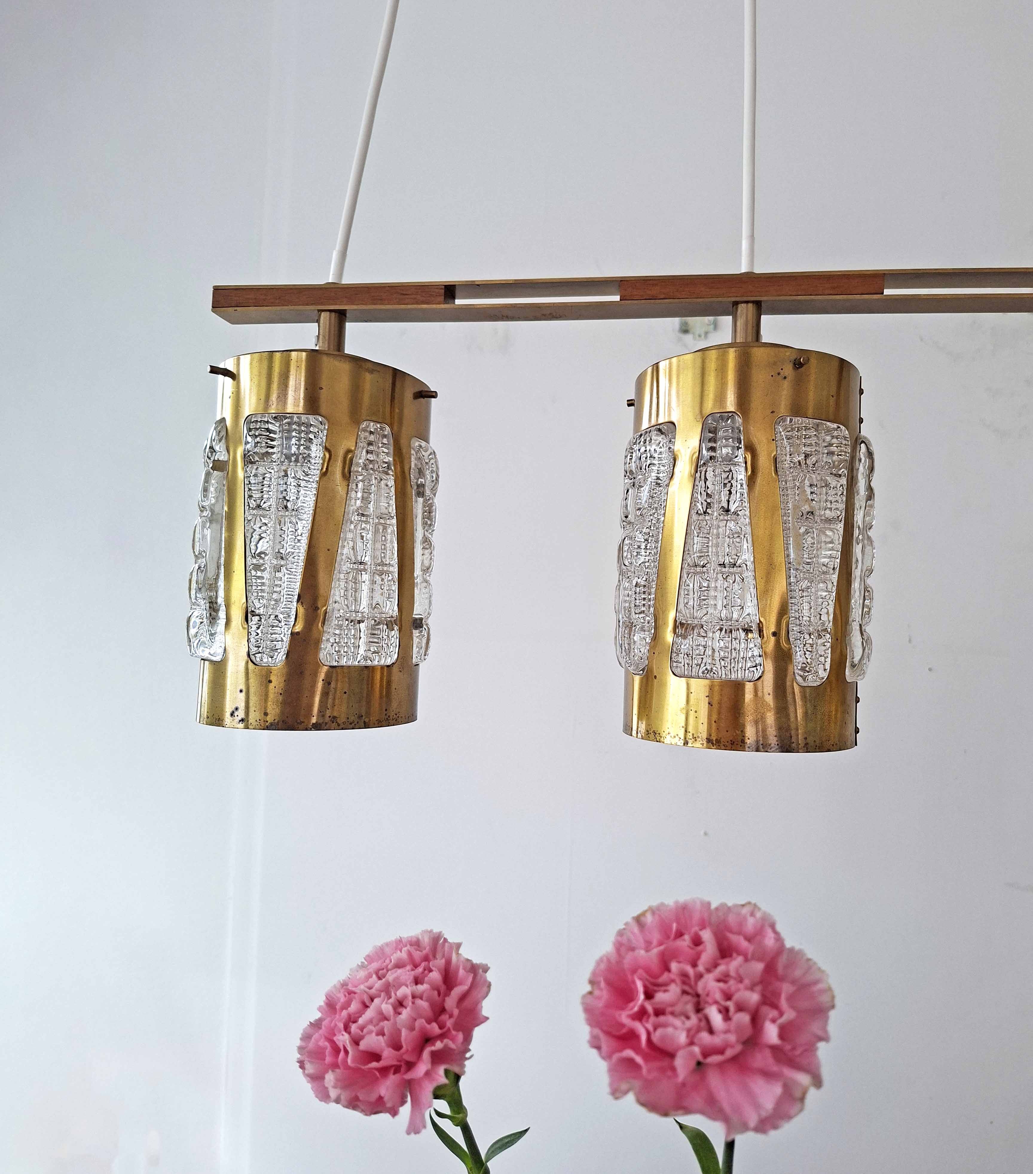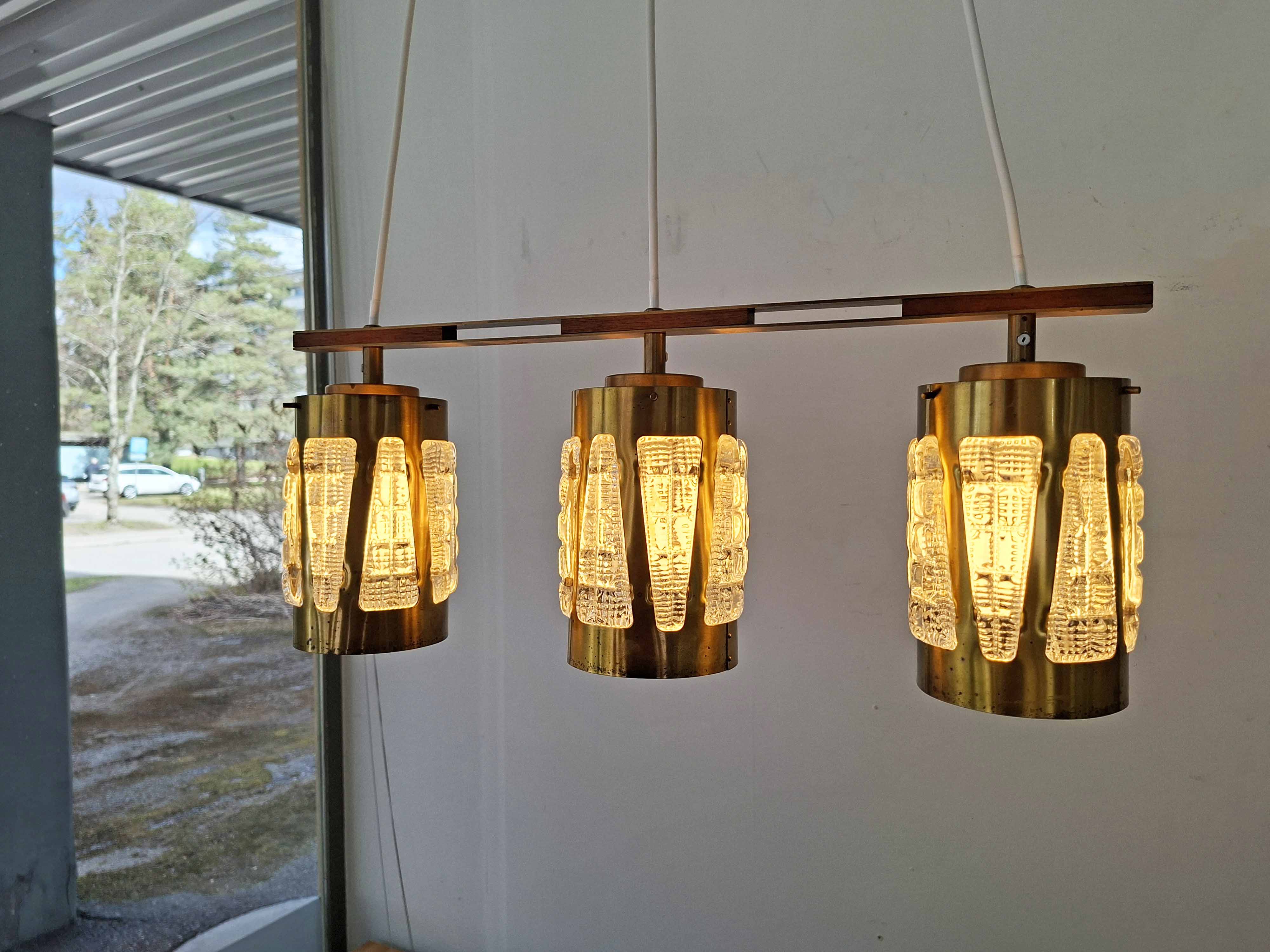 Tässä näyttävässä vintagevalaisimessa on kolme messinkistä varjostinta. Lieriönmuotoisia varjostimia ympäröivät kristalliset koristeet, jotka aikaansaavat erittäin tunnelmallisen valaistuksen. Kokonaisuuden viimeistelee tiikkinen rima, johon varjostimet kiinnittyvät.