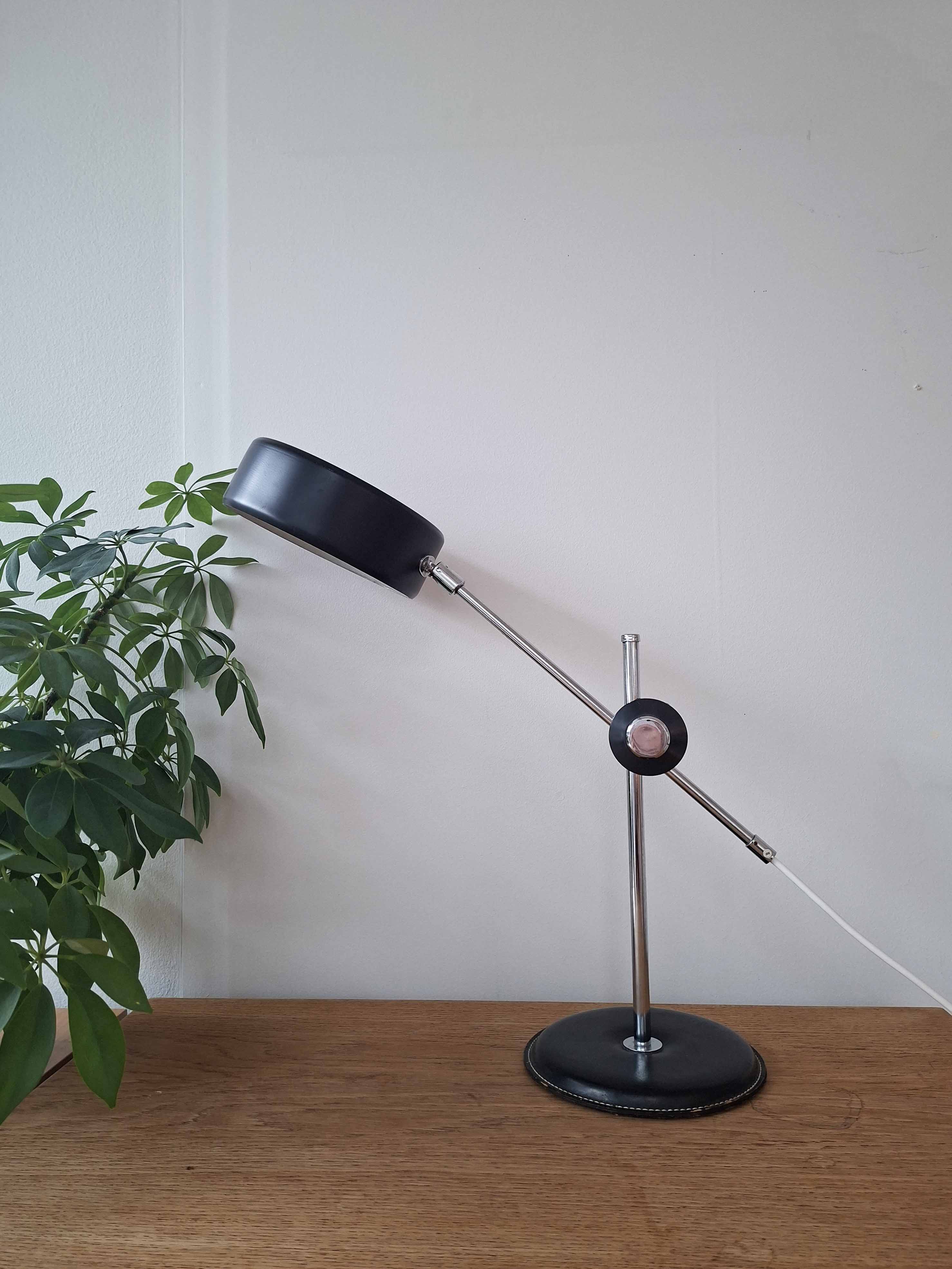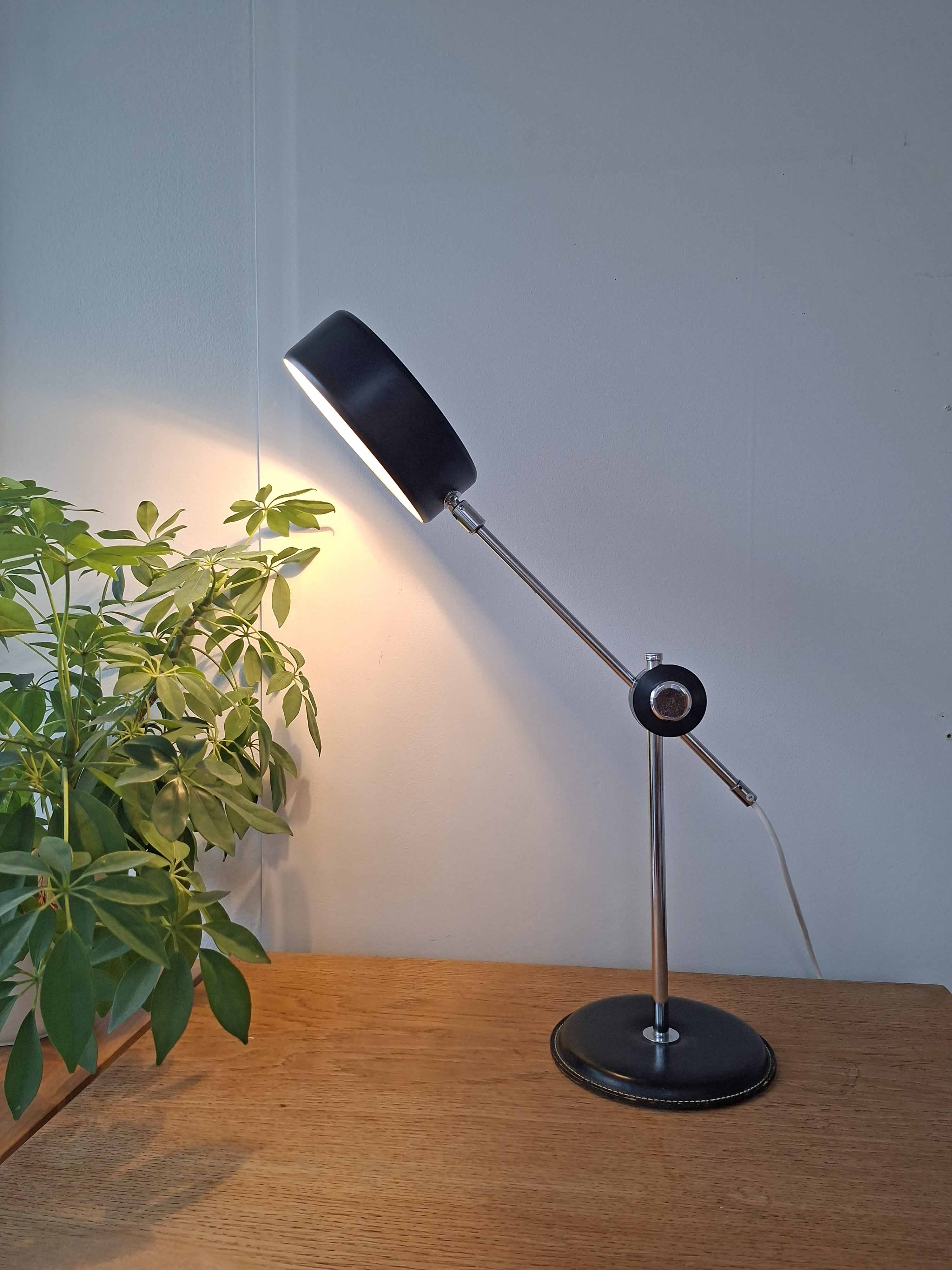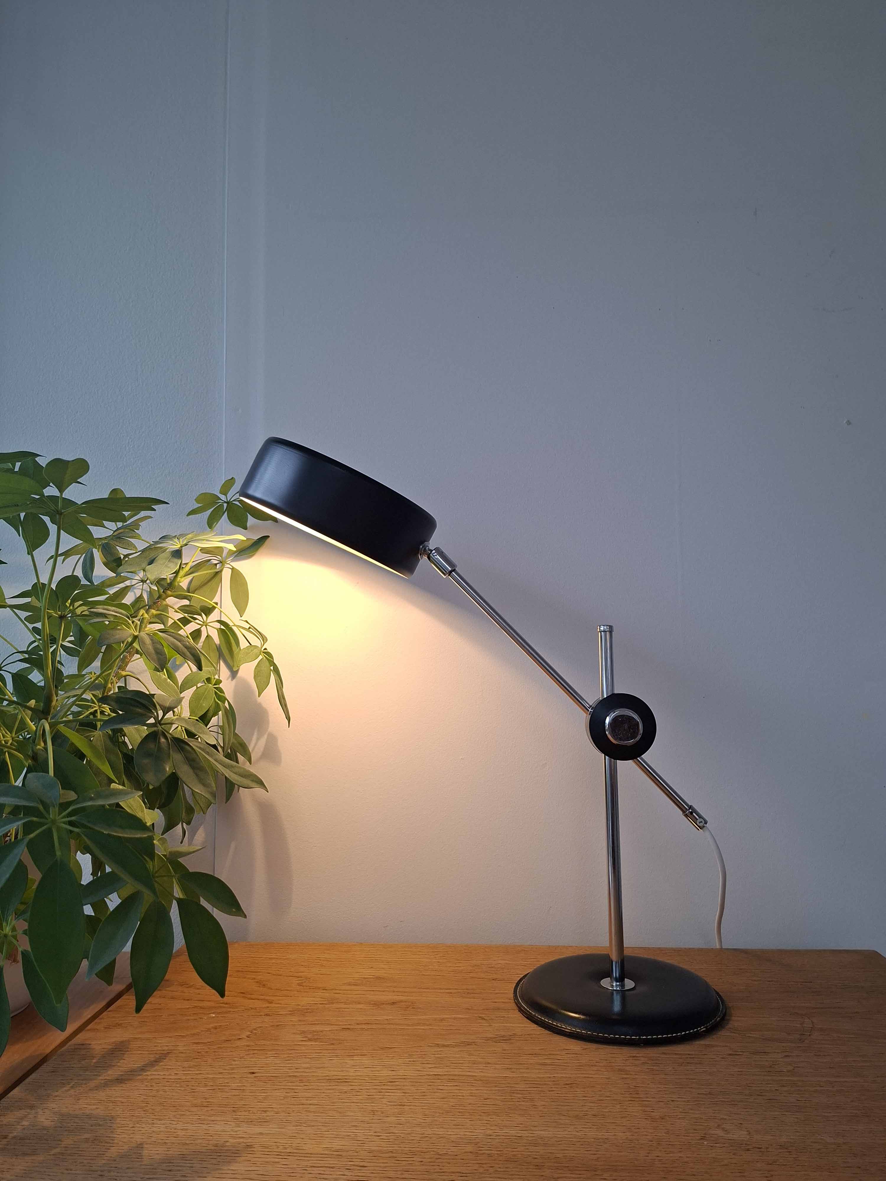 Ateljé Lyktan on valmistanut tämän hienon mustan Simriksen 1960- tai 1970 -luvulla. Valaisimessa on komea nahkainen jalka, kromattu varsi ja musta alumiinivarjostin.