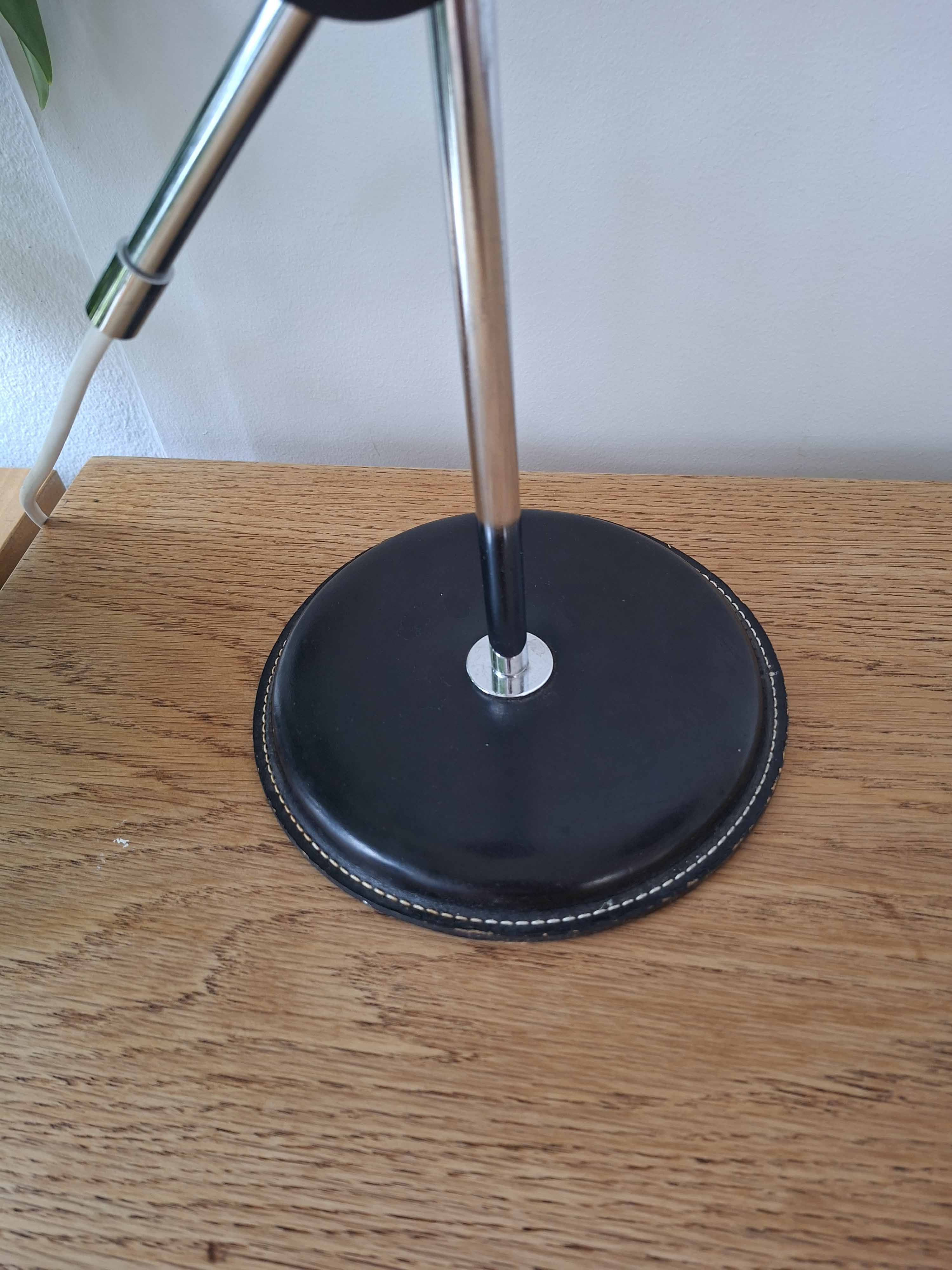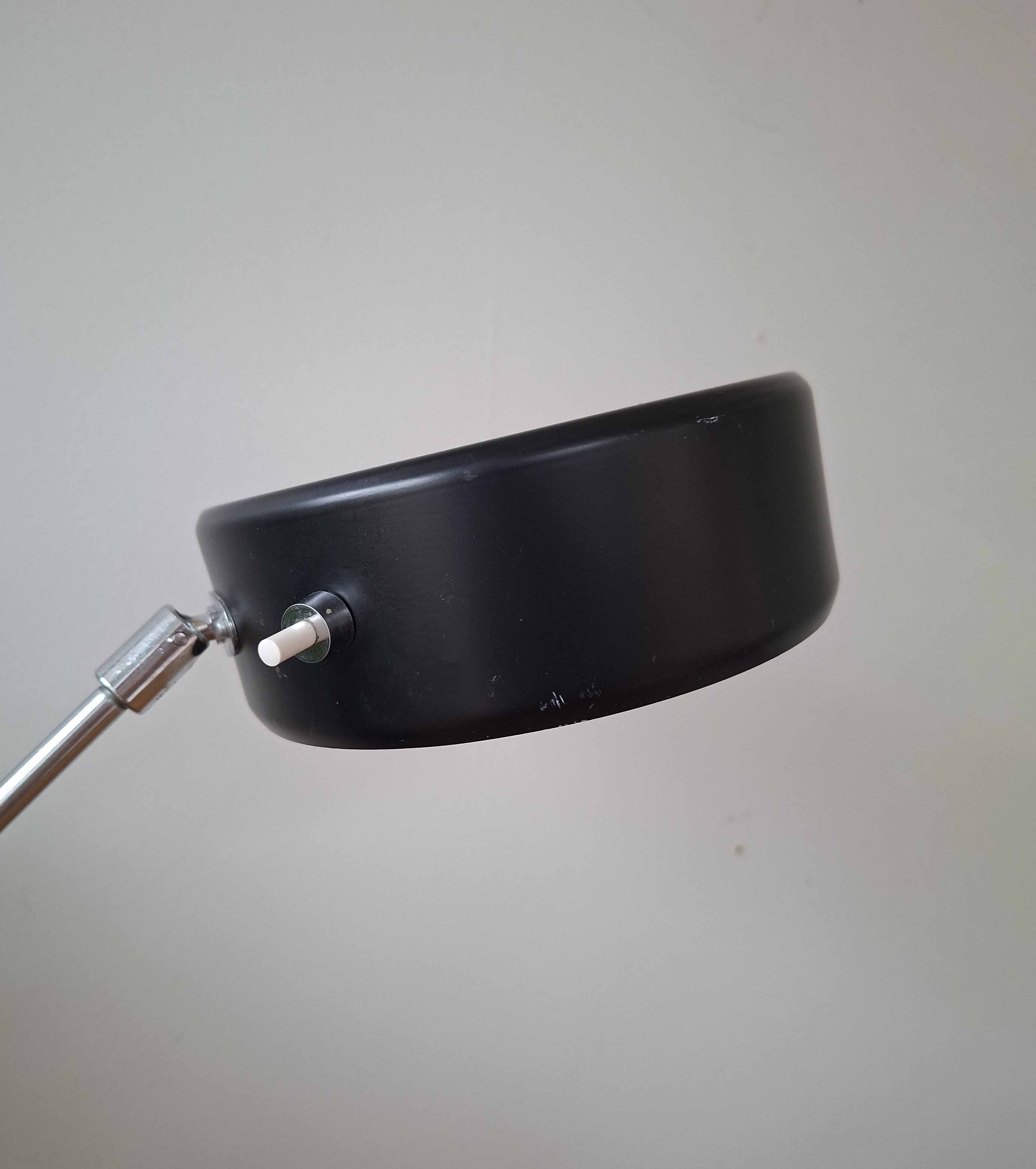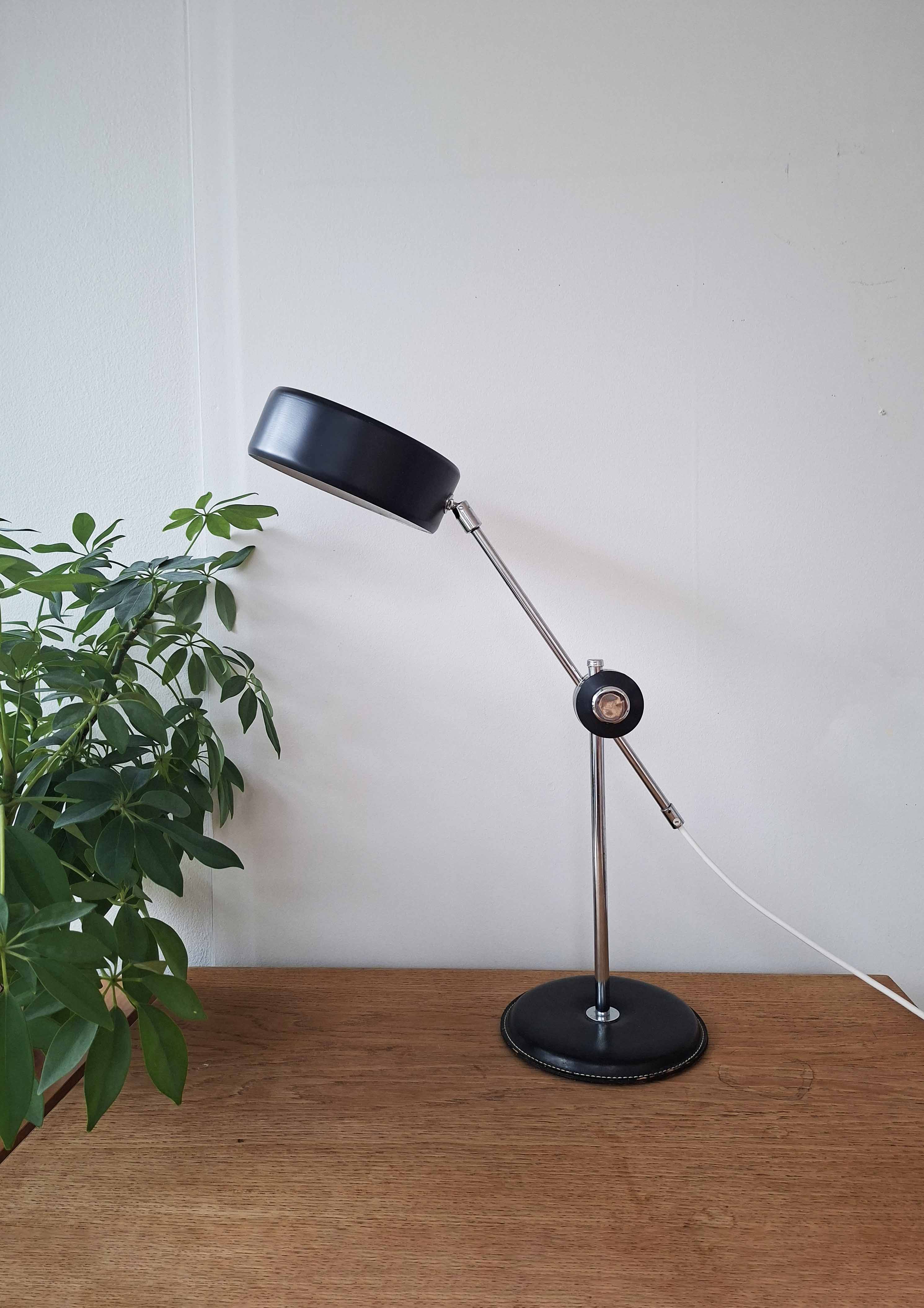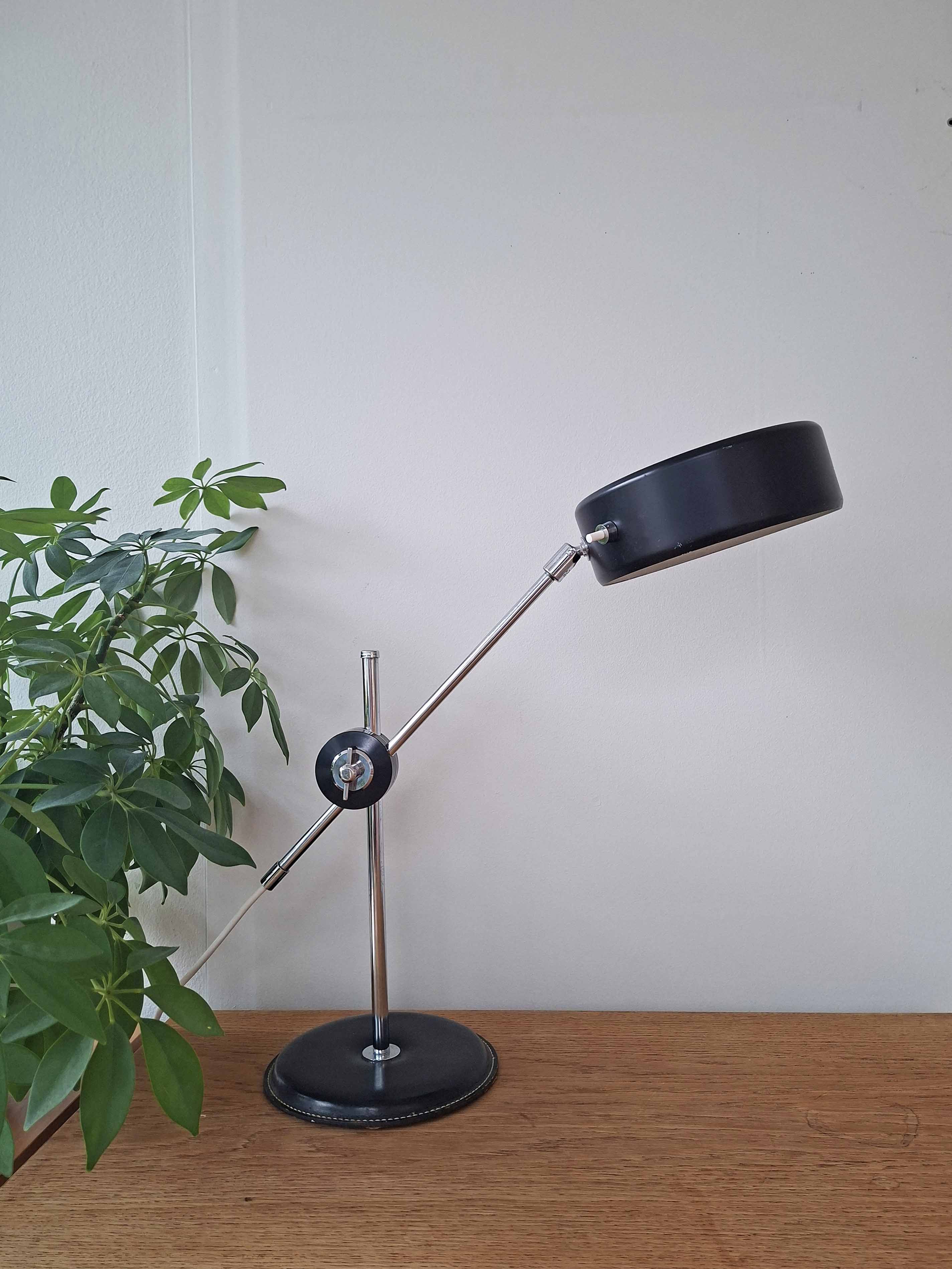 Ateljé Lyktan on valmistanut tämän hienon mustan Simriksen 1960- tai 1970 -luvulla. Valaisimessa on komea nahkainen jalka, kromattu varsi ja musta alumiinivarjostin.