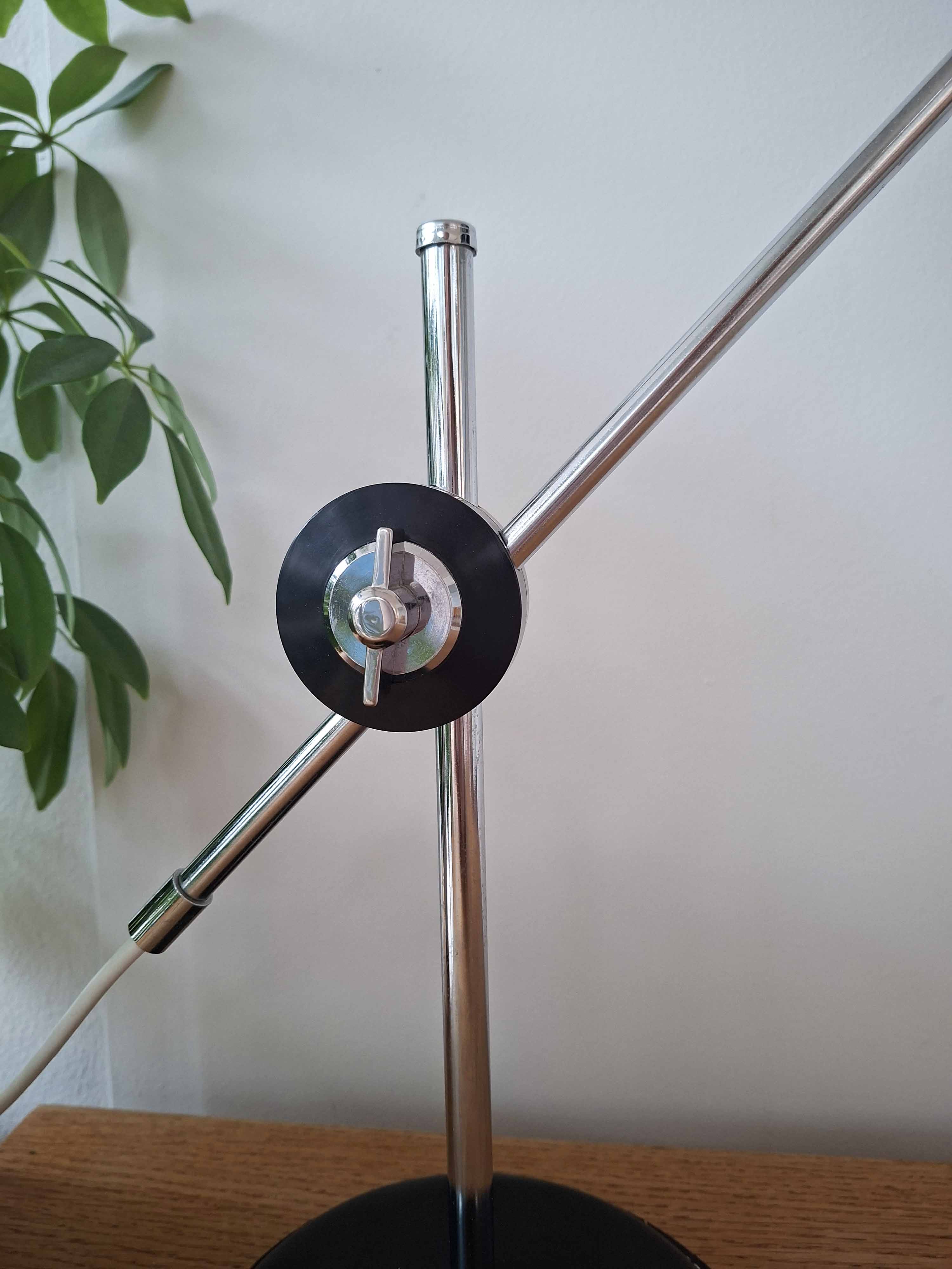 Sekä varren pituus että varjostimen asento ovat säädettävissä. Valaisin on säilynyt oikein hyvässä kunnossa. Varjostimessa pientä jälkeä.